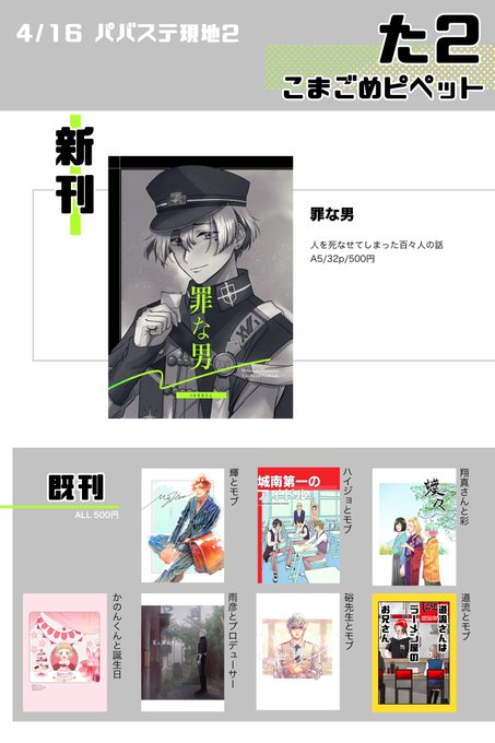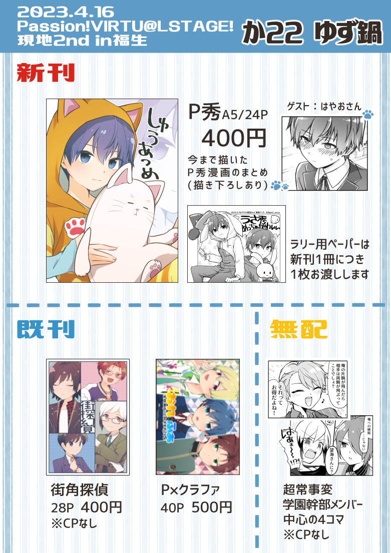 4/16パバステ現地2nd【か22】お品書き ■新刊:P秀まとめ本(新刊1冊につきラリー用ペーパー1枚) ■既刊:街探・Pファ ■無配:超常事変学園幹部中心の4コマ ※CP要素はありませんがみんな仲良しすぎるかもしれないです 既刊詳細等はpixivから→pixiv.net/artworks/10710… #パバステ現地2nd告知_0416