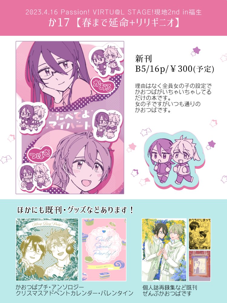 4/16パバステ現地2nd@福生のおしながきです。全部かおつばです! ごっぴさんと合同サークル【春まで延命+リリギニオ】 か17 にてスペースいただいております。 新刊サンプルはツリーで繋げたツイートをご覧ください。よろしくお願いいたします~! #パバステ現地2nd告知_0416