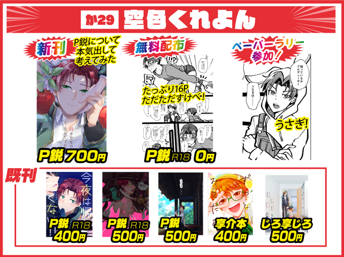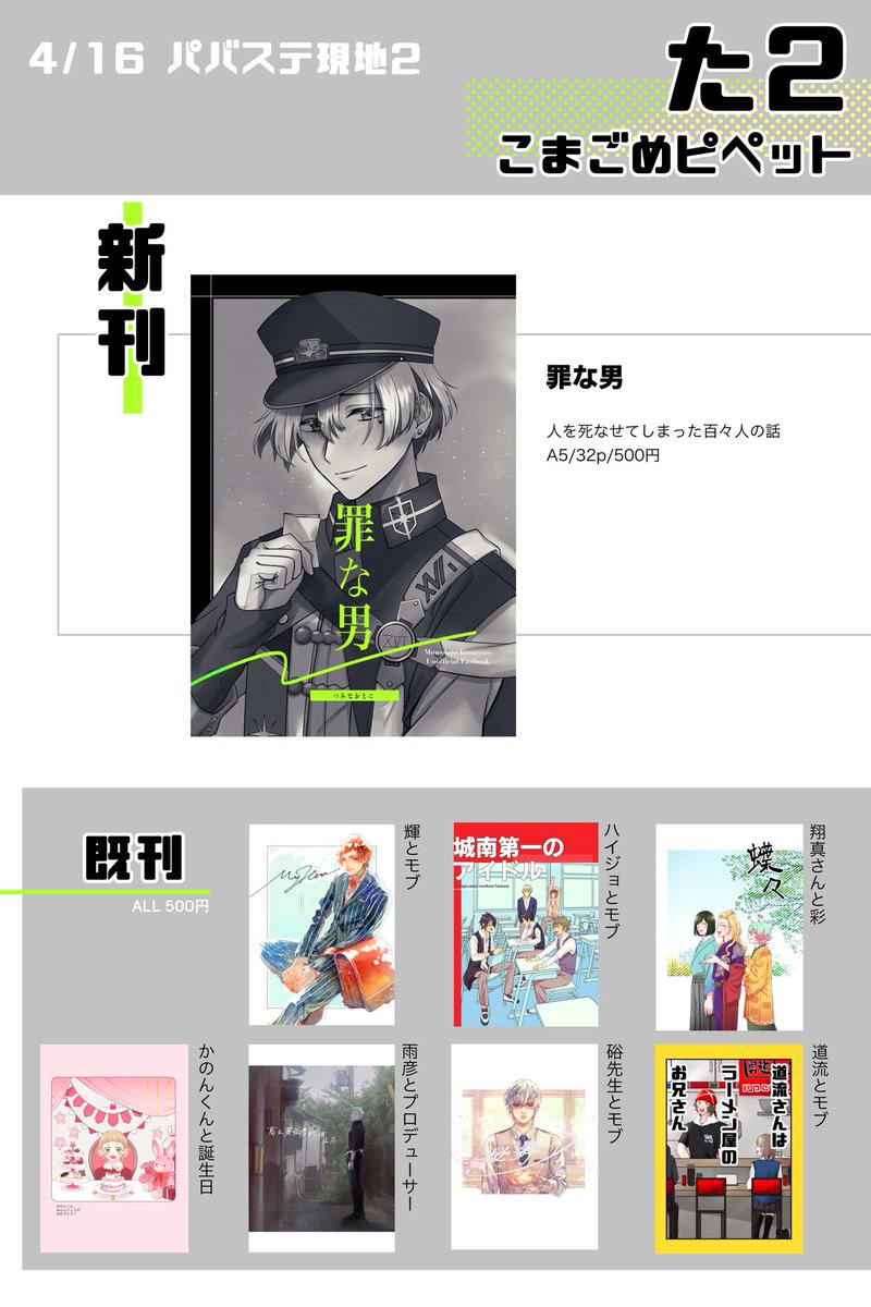 日曜のパバステ現地のお品書きです!新刊サンプル→pixiv.net/artworks/10703… ペーパーも作り終わったのでペーパーラリー参加します🥳 #パバステ現地2nd告知_0416