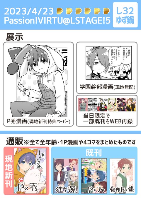 4/23開催のPassion! VIRTU@L STAGE!5に参加します!現地のP漣の新刊と既刊の頒布、 新しいものは展示かネップリは…出来たら! picrea.jp/event/2858dcd1… #パバステ5告知_0423