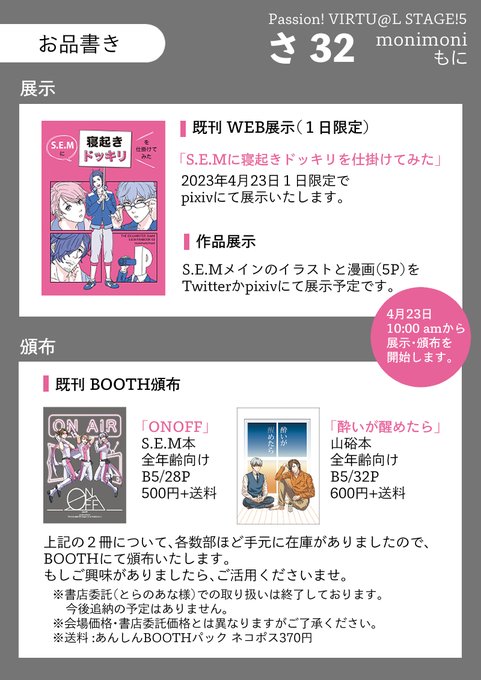 4/23(日) パバステ5【さ 32】にて参加いたします。 既刊の1日限定展示、イラスト・漫画の展示を予定しています。 既刊の手元在庫数部をBOOTHにて頒布いたします。 それぞれ、当日の午前10時から公開予定です。 展示既刊サンプル pixiv.net/artworks/78856… よろしくお願いします! #パバステ5告知_0423