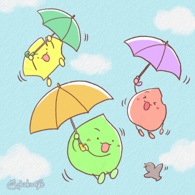 おはばコ~☀️ 今日はみんなで傘のパラシュート🪂 ふわふわふわーって降りてくよー˙˚ʚ(。・ω・。)ɞ˚˙ #軽い方が落ちるのが遅い #らっかさんは死語? #一日一絵 #あおばコ #傘 #パラシュート #ゆるいイラスト #イラスト #OCイラ #みんなで楽しむTwitter展覧会
