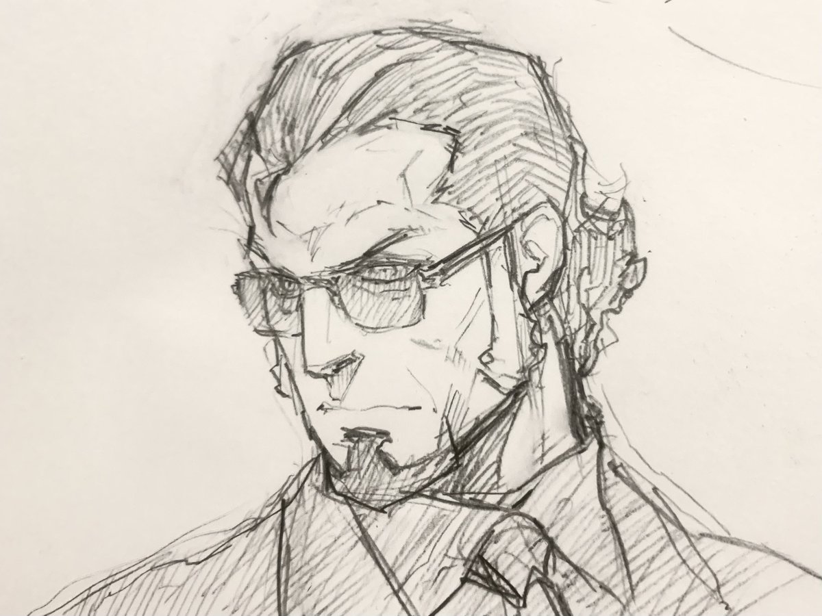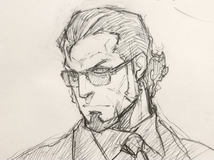 #1日1ラクガキ 音成刑事。 ベテランと若手の刑事コンビは映画『セブン』が好き。 ちなみに刑事は(警部とかと違って)階級では無いので、音成巡査とか音成巡査部長とかなんでしょうなー。 #GMODEアーカイブス #探偵癸生川凌介事件譚 #仮面幻想殺人事件 #パラノマサイト