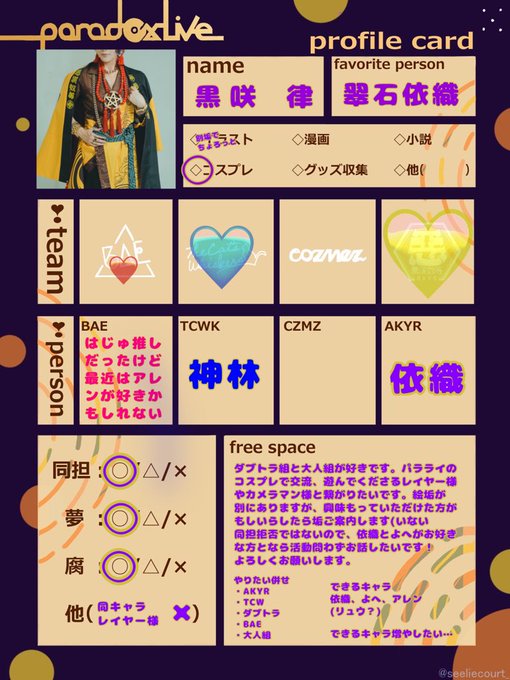 私も新しい出会いが欲しいので書き直しました。よろしくお願いいたします✨ #パラライ好きさんと繋がりたい #パラライ自己紹介カード #パラライ好きと繋がりたい #paradoxlive自己紹介カード #レイヤーさんと繋がりたい #カメラマンと繋がりたい