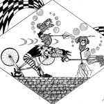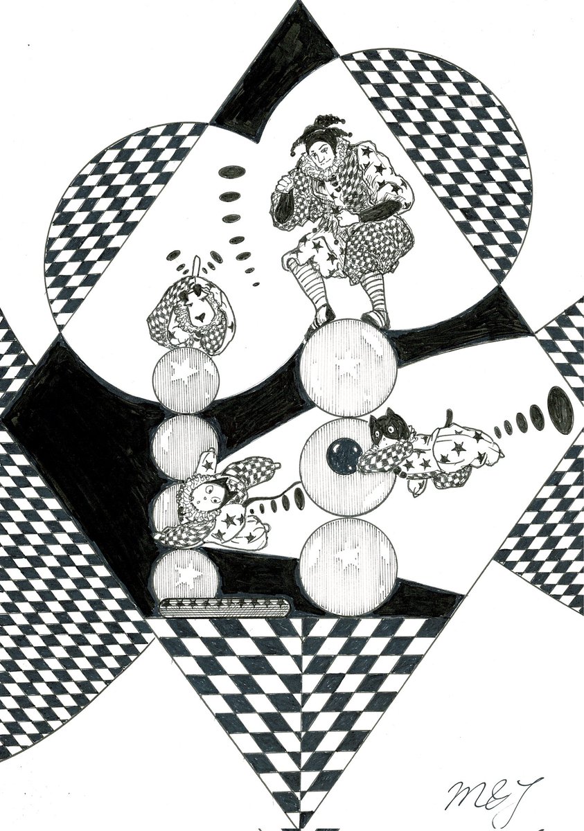🔵「球体の中」🔵 《道化師と陽気な仲間たち》によるパントマイム🎪🃏😸😺🐶 #道化師と陽気な仲間たち #オリジナルキャラクター #アトリエの系譜S #アナログ #モノクローム #ペン画 #パントマイム #道化師 #猫 #犬 #picturebookillustration #球体 #パフォーマンス