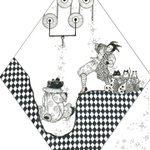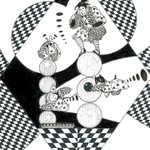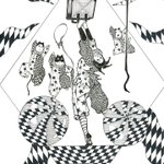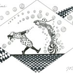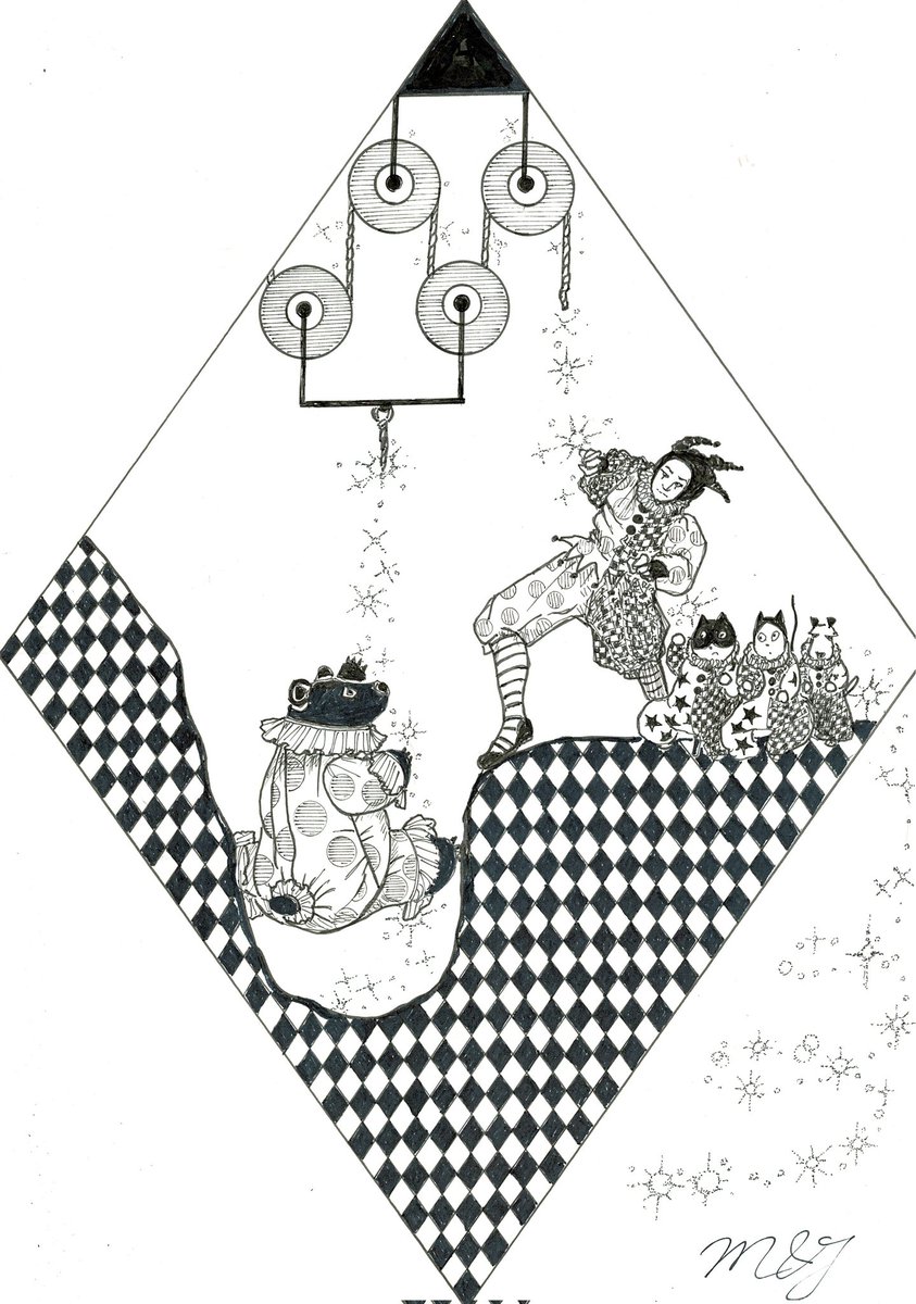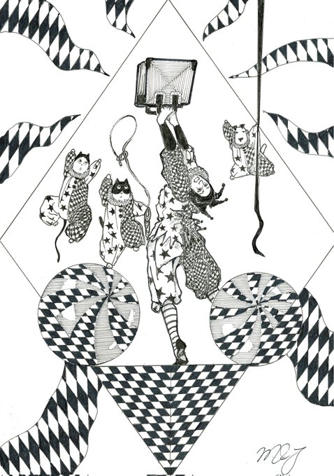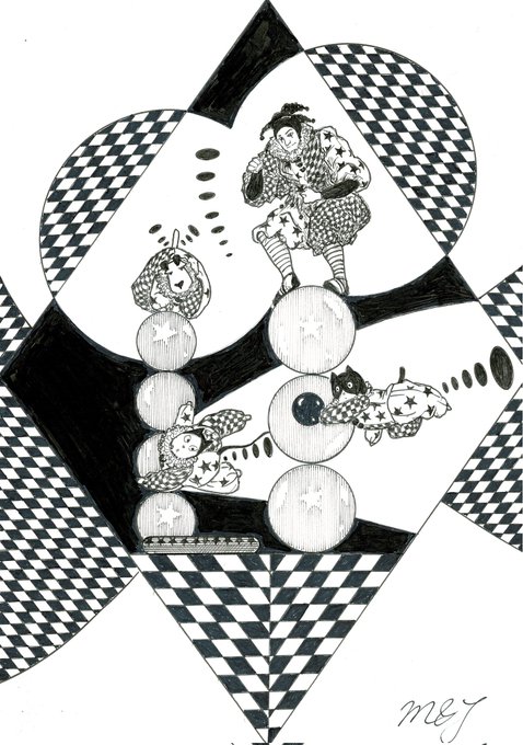 🦾引き寄せる💪 🎪🃏😸😺🐶《道化師と陽気な仲間たち》によるパントマイム #アトリエの系譜S #道化師と陽気な仲間たち #アナログ #モノクローム #ペン画 #オリジナルキャラクター #mangastyleillustration #picturebookartwork #パントマイム #道化師 #猫 #犬 #animallovers #引く