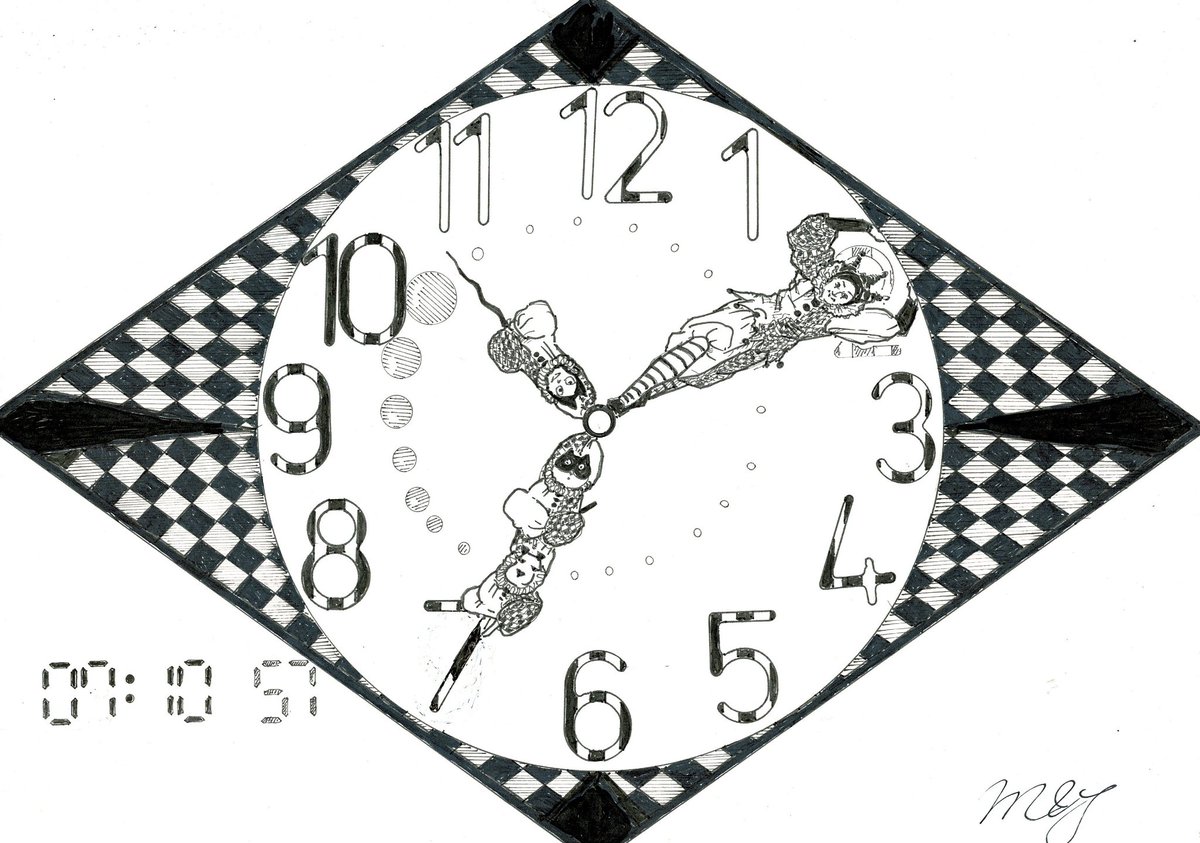 《道化師と陽気な仲間たち》による、アクロバティックなパントマイムショー🎪🃏😸😺🐶 🕰️アナログ時計 時刻は07:10:57 #道化師と陽気な仲間たち #マンガスタイルイラスト #アナログ #モノクローム #アトリエの系譜S #ペン画 #パントマイム #アクロバット #時計 #時間 #オリジナルキャラクター