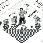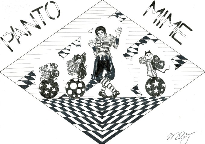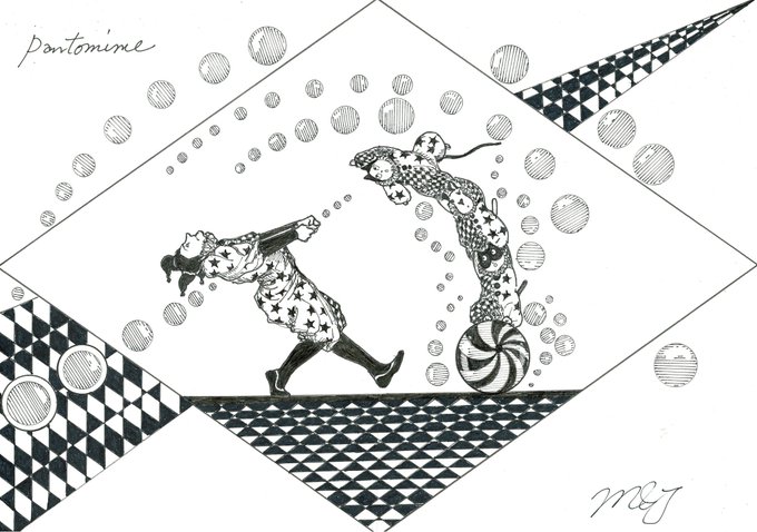 🎭👀✋🤚❝見えない壁❞ 🎪🃏😸😺🐶《道化師と陽気な仲間たち》によるパントマイム #道化師と陽気な仲間たち #アトリエの系譜S #アナログ #モノクローム #ペン画 #マンガスタイルイラスト #picturebookillustration #挿絵 #オリジナルキャラクター #道化師 #パントマイム #見えない壁