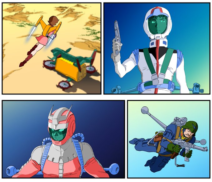 ジオン軍のパーソナルジェットは地上でも宇宙でも同じタイプの物を使用しますが、連邦軍のパーソナルジェットは地上と宇宙とでなぜかデザインが異なります。これは多分ですが、連邦の物は地上で使ってる間は『ダイターン3』からの流用デザインで問題なかったのが… #パーソナルジェット
