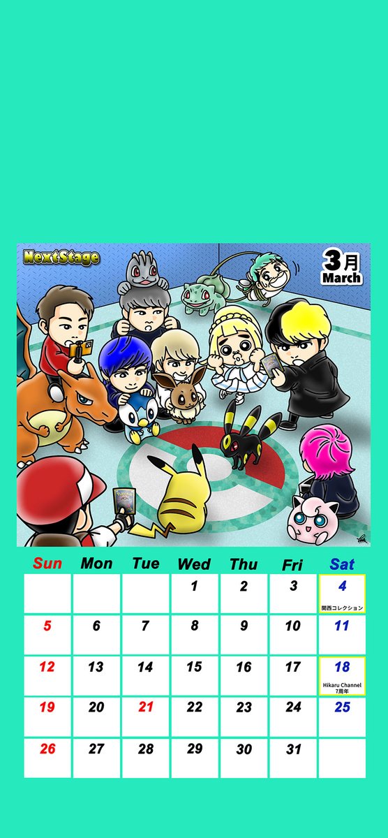 3月のカレンダーです🗓 そして #今日はポケモンデー ・セブンイレブン 2CS56SB3 ・ファミリーマート 25PYQ5LNQE 期限▶︎▶︎3月6日 #PokémonDay #ヒカルファンアート #ネクステ #ネクステイラスト #チビネク
