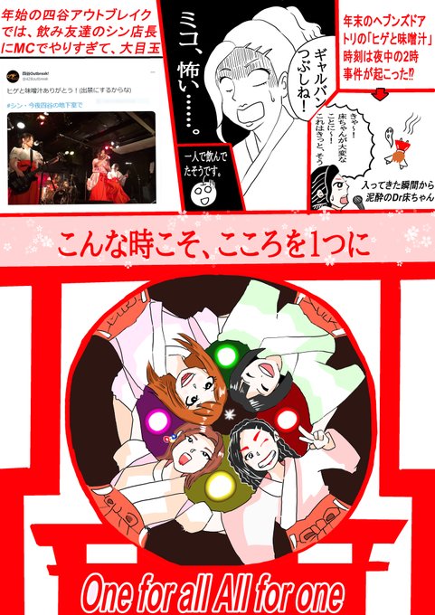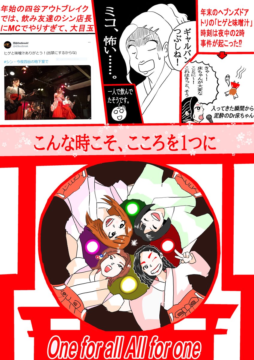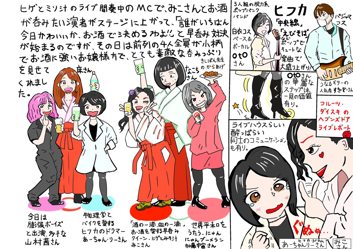 年末年始の #ヘブンズドア #四谷アウトブレイク での #ヒゲと味噌汁 ライブレポート兼 #ファンアート を描きました。産休前のこんちゃんが参加してのフルメンバー、そして、もしカメラを真下に置いたら、どういう #イラスト になるだろう?😯 そう思って描きました😆 #ライブハウス盛り上げ隊