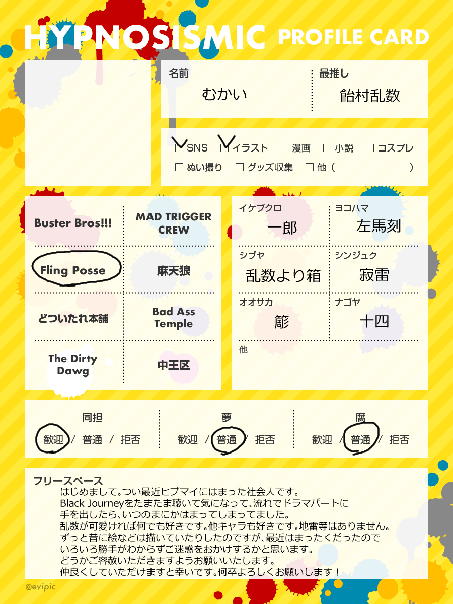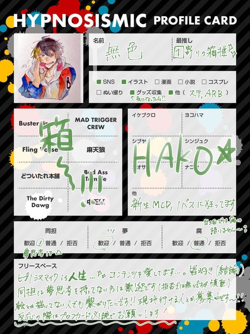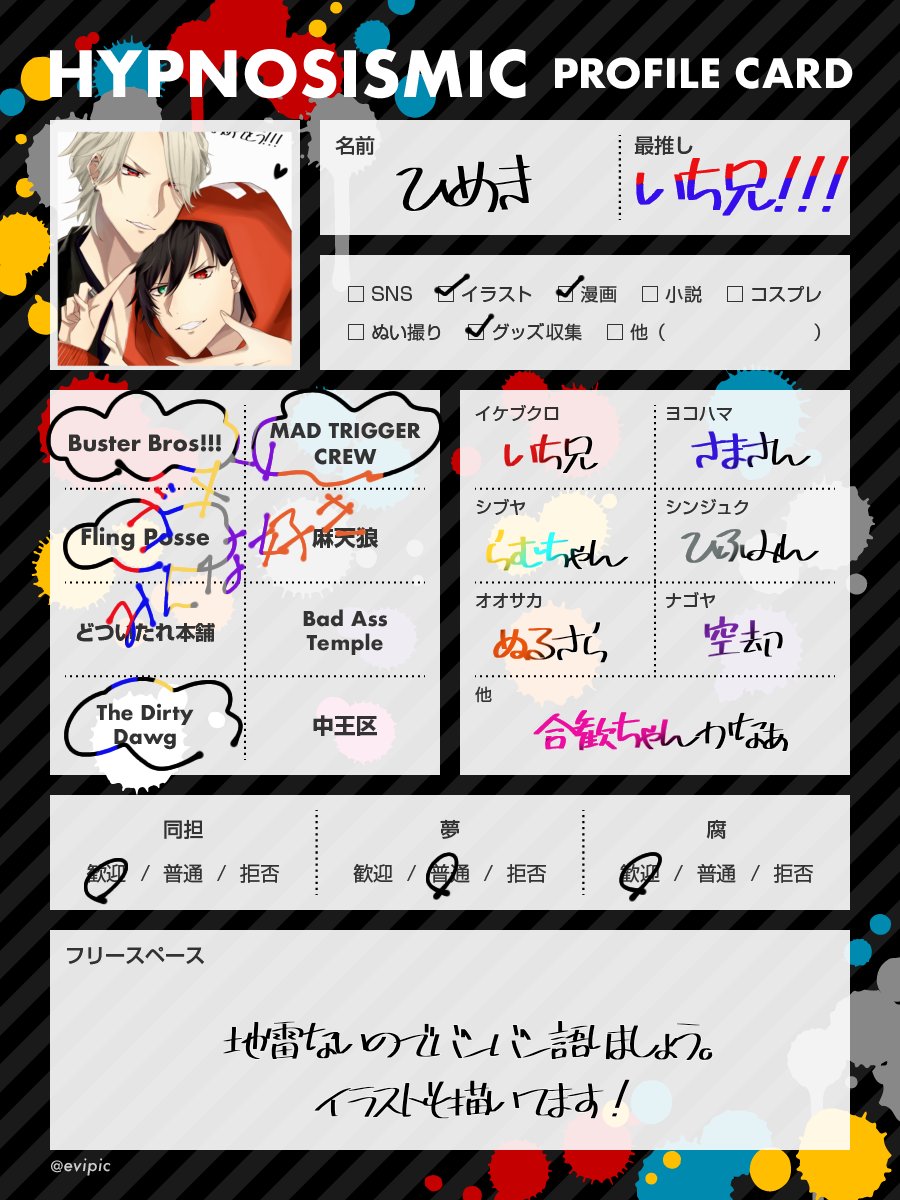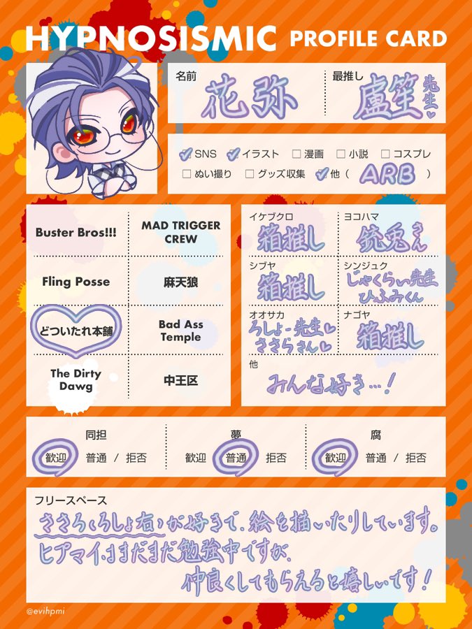 #ヒプマイ自己紹介カード #ヒプマイ絵描きさんと繋がりたい #ヒプマイ好きさんと繋がりたい #ヒプマイ好きな人と繋がりたい 載せ直しやぁ!(?) たまにイラスト描く18↑です!!地雷ないのでどなたでもどーぞ!! ♻️中心に♥やリプでも気になった方お迎え行かせていただきます💓
