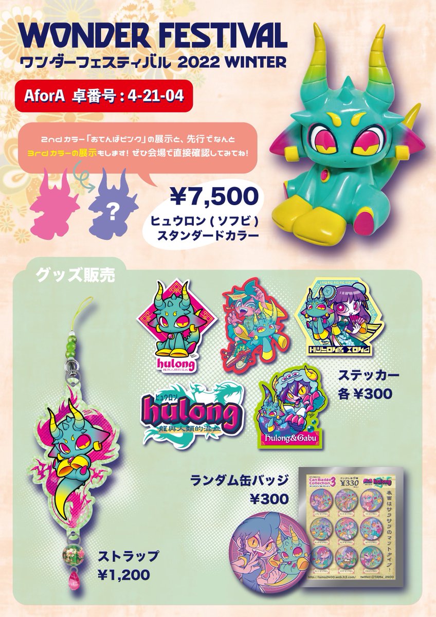 【#ワンフェス おしながき】 ブース:5-12-10 新色『らむねスカイブルー』を販売!きんぐドリームとピンクラメもごく僅か在庫あったので持って行きます。 5ホールの出入口が近め!今回もちゃそと一緒に出展するのでよろしくお願いします〜🐉🌈 #ヒュウロン #ワンフェス2023S #WF2023夏 #wf2023s twitter.com/tama_2400/stat…