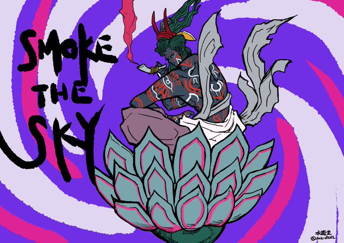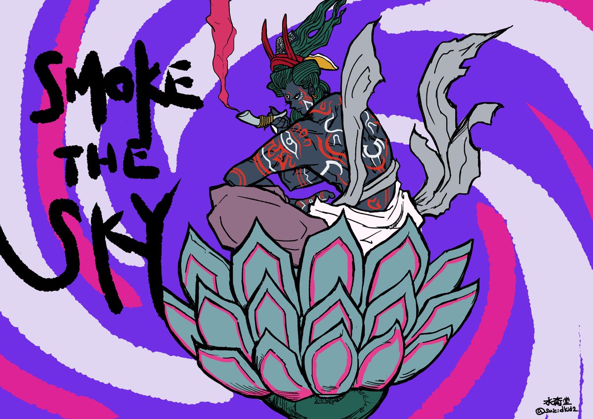 『SMOKE THE SKY』 シヴァ神は大麻を好むという。 その御膝元であるバラナシでは交番の前でガンジャ入りラッシーを堂々と売っており随分驚いた。街によっては合法なんだとか。 法は人の上にあるが、結局は作る側の価値観に依るんだなと妙に感心した。 #ヒンドゥー教 #絵描きさんと繋がりたい