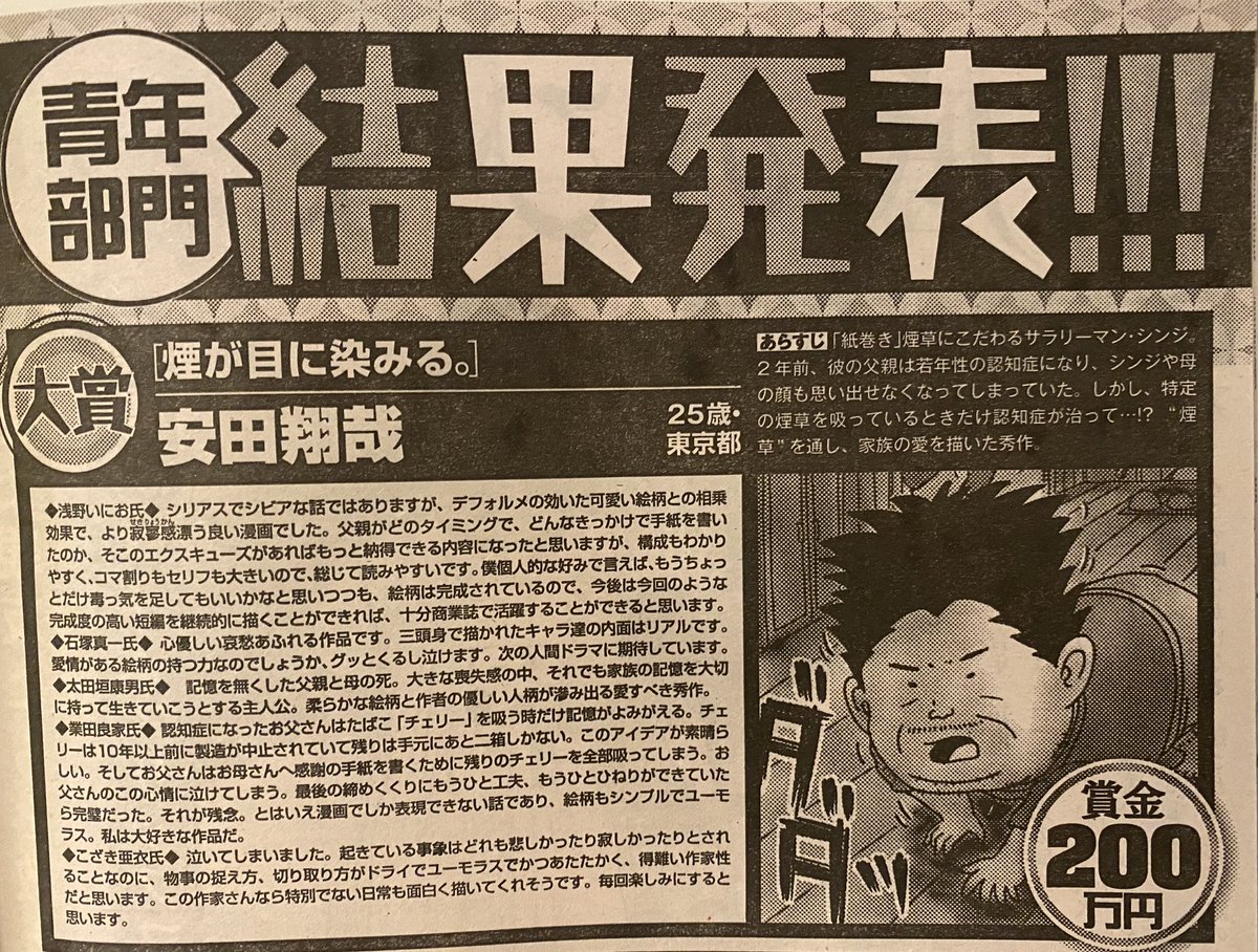 小学館の漫画賞で大賞(グランプリ)を頂きました。 公式サイトから読めるので、ぜひ読んでみてあげて下さい。 (shincomi.shogakukan.co.jp/viewer/92/04/2…) そして #ビッグコミック 本誌にも掲載予定なので、その際にもまたぜひ読んでみてあげて下さいませ。 #小学館新人コミック大賞 #漫画がよめるハッシュタグ