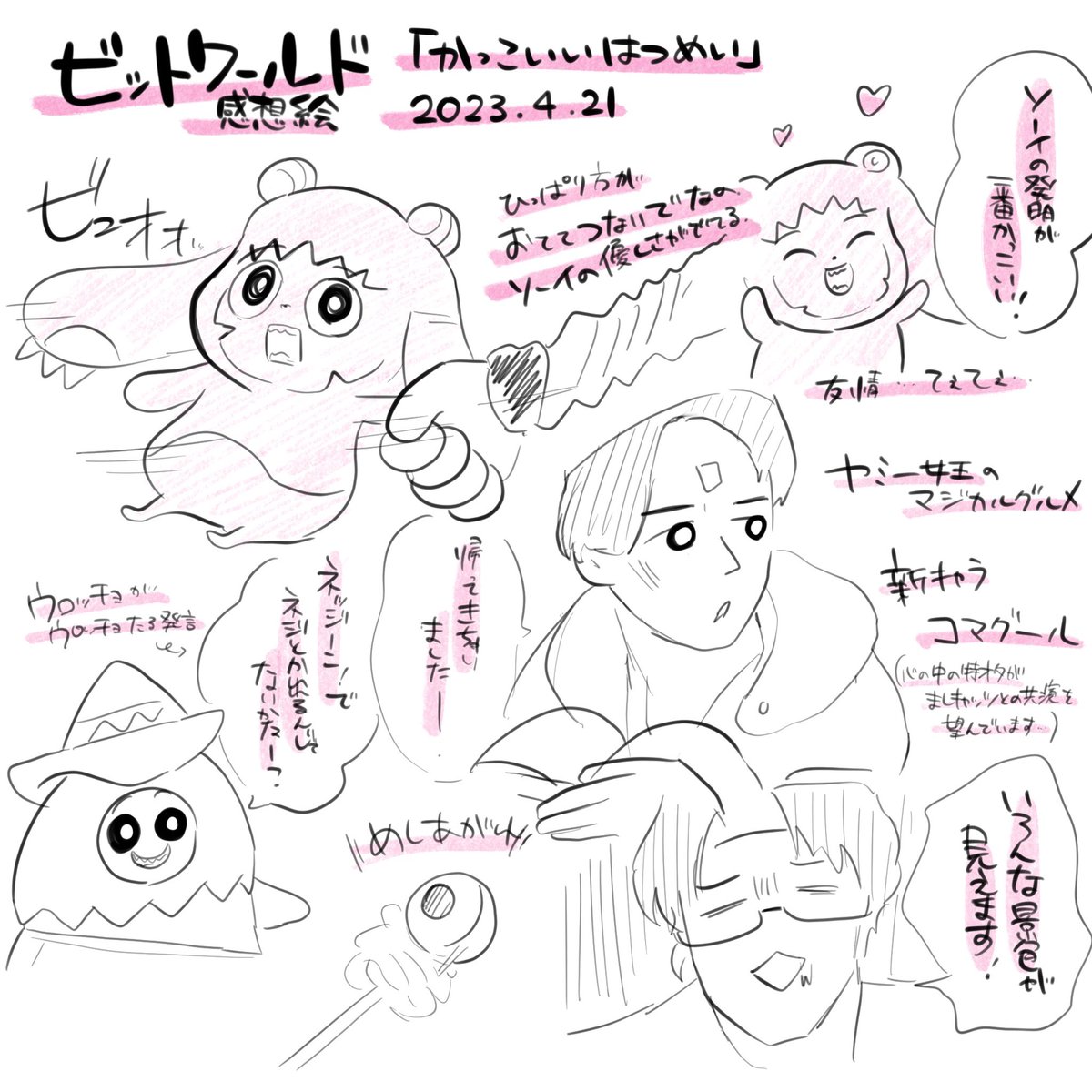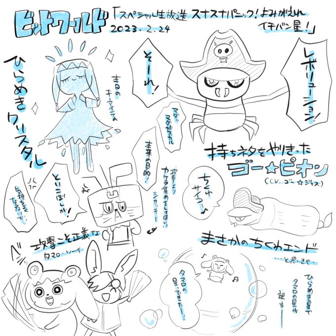 本日の #ビットワールド スペシャル生放送でした💎 ゴー☆ピオンからはモロ中の人が滲み出てた感じが…笑 そしてシカッキーがゲーム中人が変わるのはいつものことということで…。 ラストは衝撃の展開…! タマロの星、誕生! ー 完 ー #でんたくのビトワ感想絵
