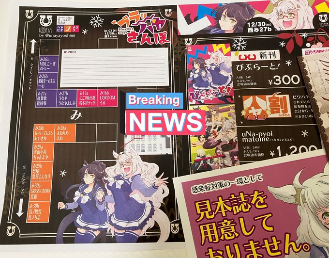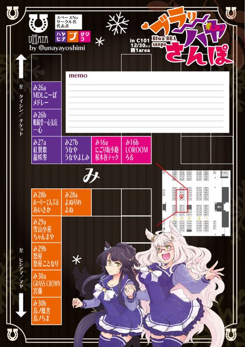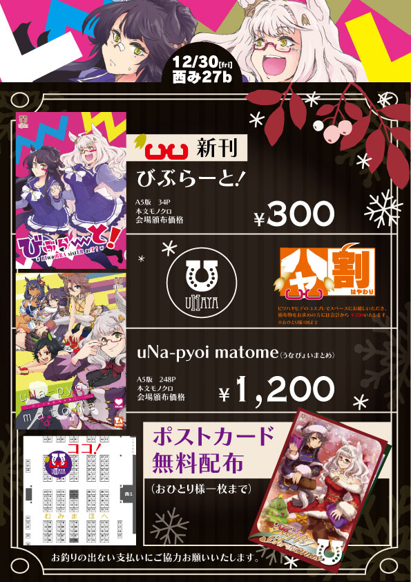 冬コミお品書きです 「30(金)西み27b【ミニなビワ】」うなや webcatalog.circle.ms/Circle/Map/168… 新刊の姉妹本「びぶらーと!」と既刊まとめ本、 クリスマス姉妹のポストカードの無料配布もございまして 姉妹盛り盛りでお届けいたすよ! #ビバキャワヒデ