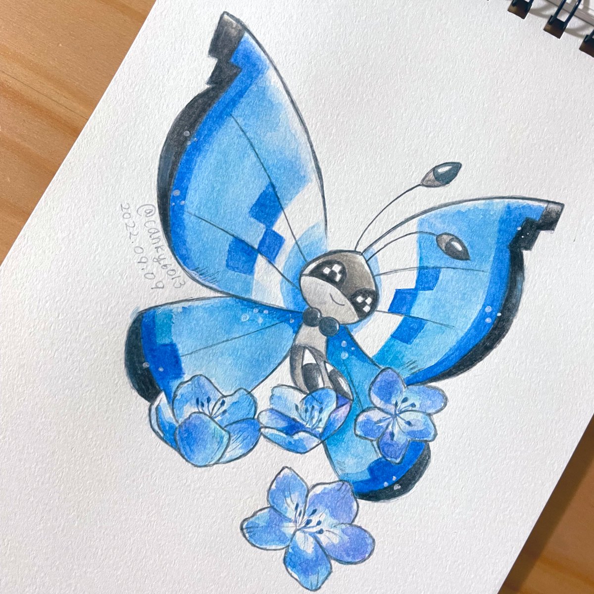 35日目、ビビヨン🦋本当にBaby Blue Eyesシリーズ最高です🙏🏻今60色の色鉛筆の中で青が断トツ多いので青系描くの大好き🥺✨今日めちゃ時間かかったけど満足😇 #100日チャレンジ #ポケモンイラスト #ビビヨン