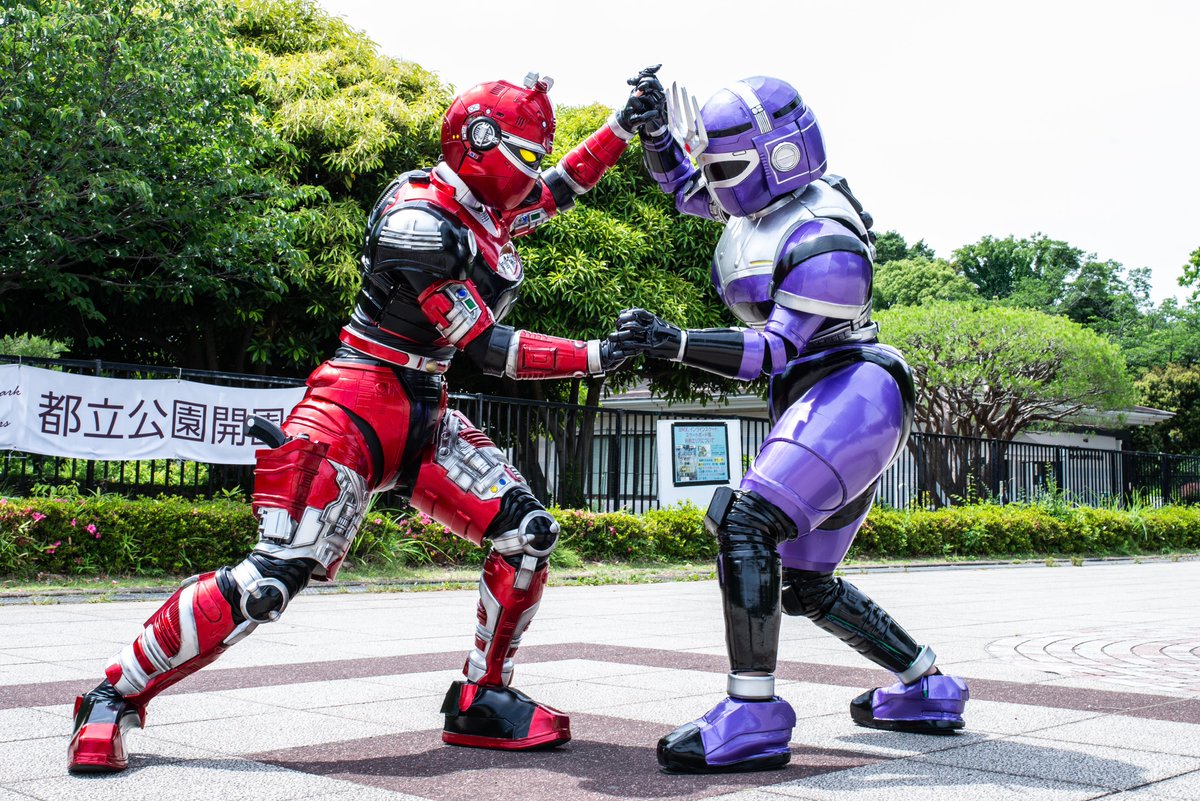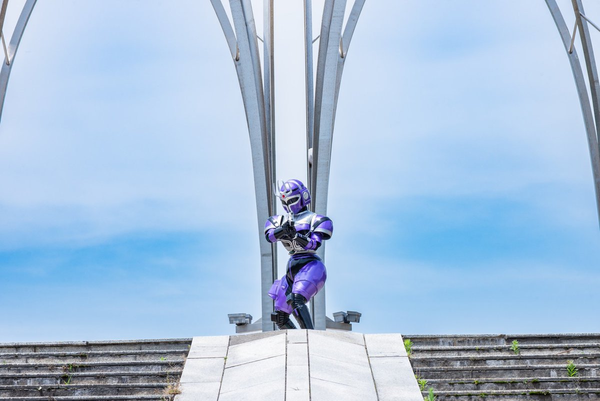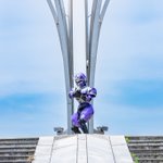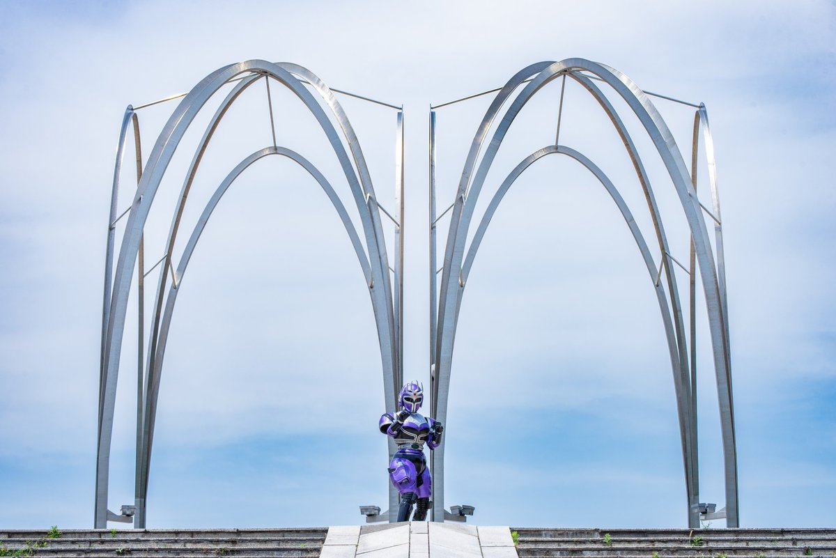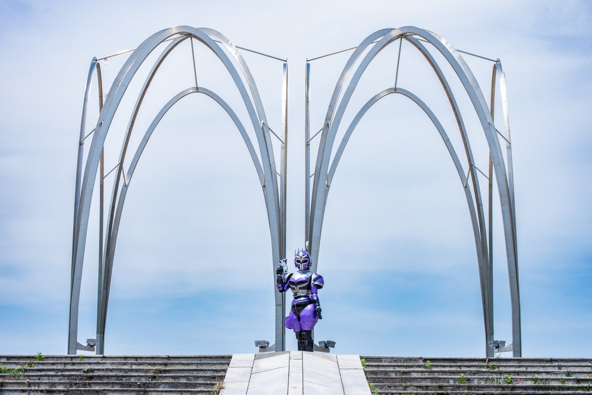 Cosplay 光が丘公園・光のアーチ階段側からの画角! こちらもスチール写真を意識。 めっちゃカッコよくないですか?|ω・) 📸→ @osa_gekka 🐞🟣→自分 🐞🟣スーツ作成・持ち主→ @BFtento_redle #BFカブト #ビーファイターカブト