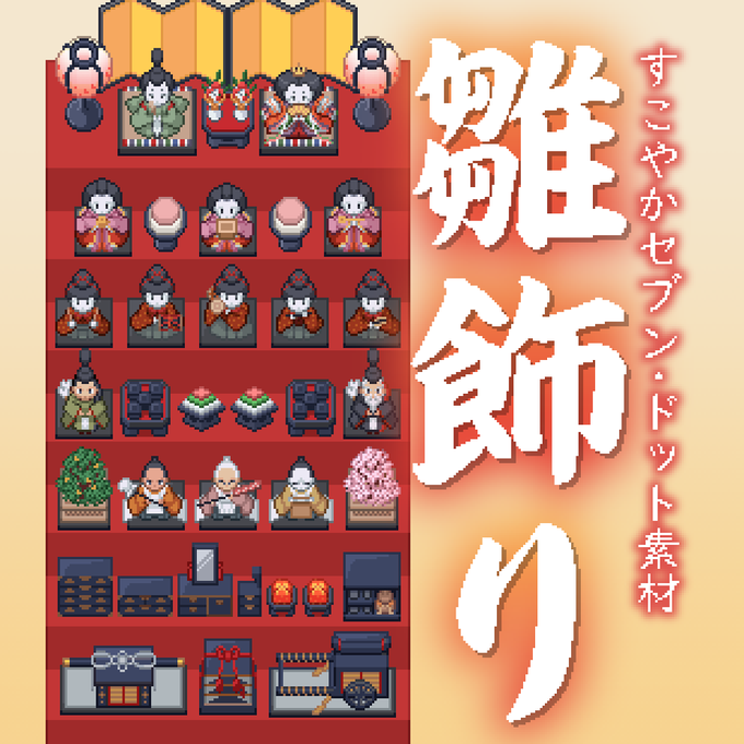 ピクトスクエアやoViceで使える雛飾りドット素材販売中です。無編集で置ける雛飾りはもちろん、雛壇、小物、人物の全て単体で素材を用意しているので雰囲気を合わせたオリジナル雛壇も作れます。 kenhichi.booth.pm/items/2989154 #ピクスク #pictsquare #ピクスク素材 #ドット絵 #すこやかセブン