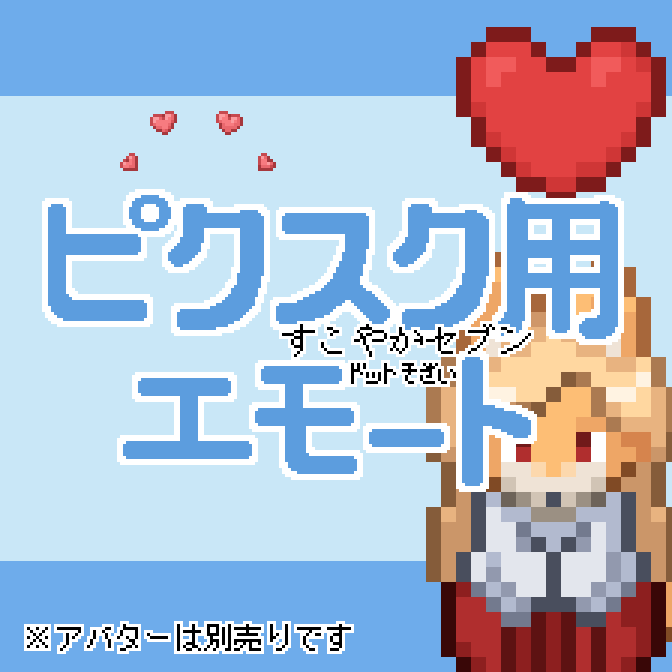 オンライン即売会「pictsquare」やバーチャルオフィスツール「oVice」でサイズそのままカスタマイズ形式で使えるドット絵素材販売中です。その他、動画やサムネイルの彩りにもお使い頂けます。kenhichi.booth.pm/item_lists/n31… #pictsquare #ピクスク素材 #oVice #ドット絵 #すこやかセブン