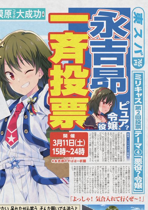 3月11日(土)15時~24時、スタートダッシュの永吉昴一斉投票企画、どうぞよろしくお願いいたします! 私も溜めたチケットを開幕フルブッパ、片膝つきながら投票ボタン押します…! 昴に興味持っていただいた方は是非 #ピュア令嬢昴 で検索を! #ミリオンキャスティング