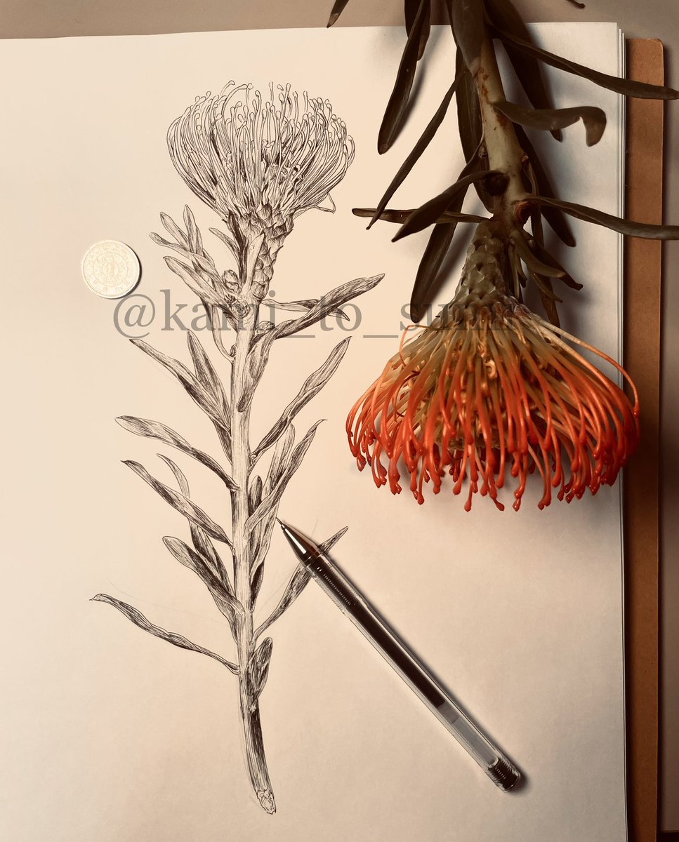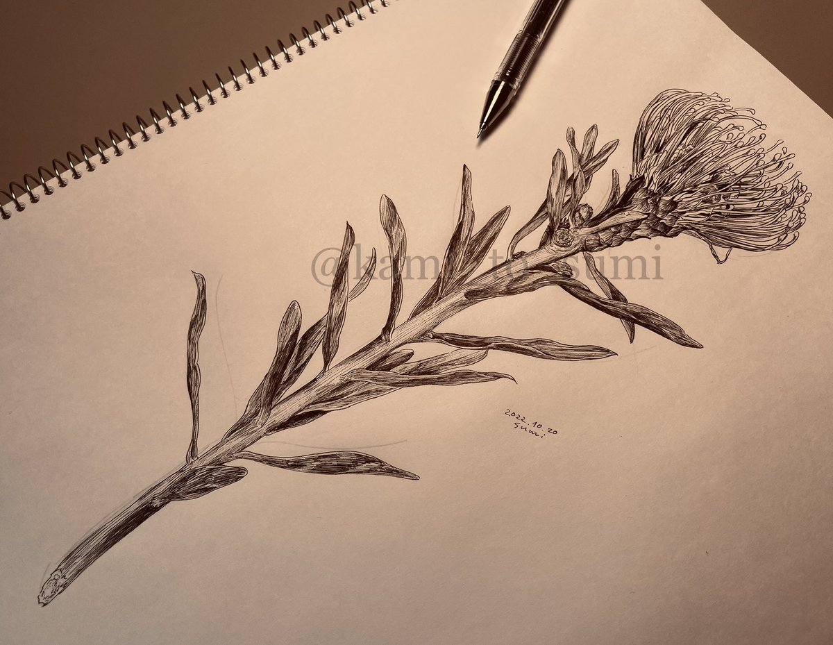 昨晩の植物画、全体です🌿 急いで描いたけどいい感じに仕上がったかも◎ 細部まで見てください! #イラスト #illustration #inkart #ペン画 #植物画 #botanicalart #ピンクッション #アナログ絵
