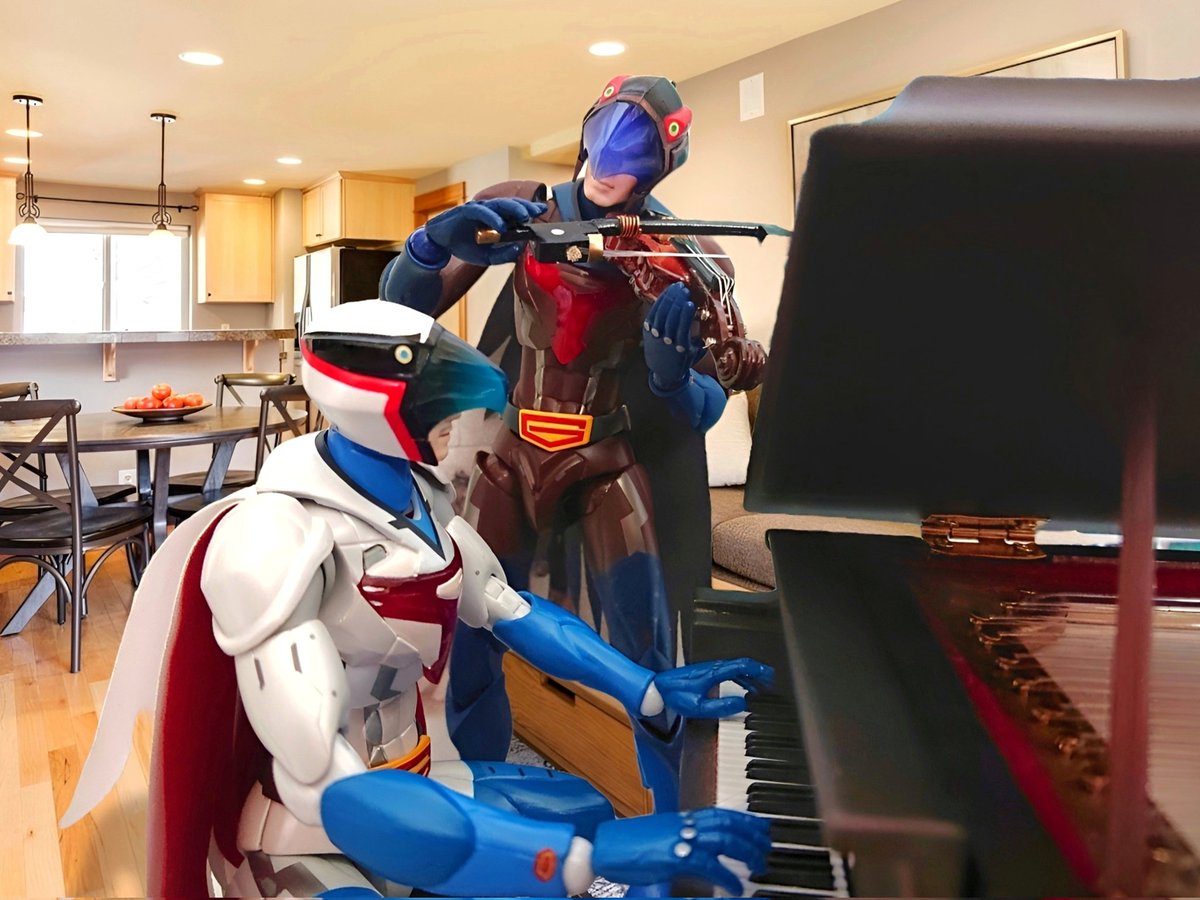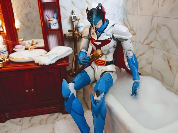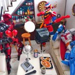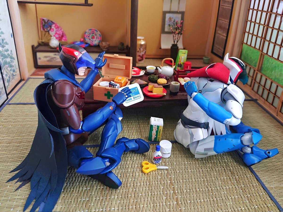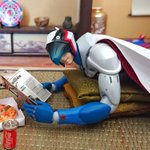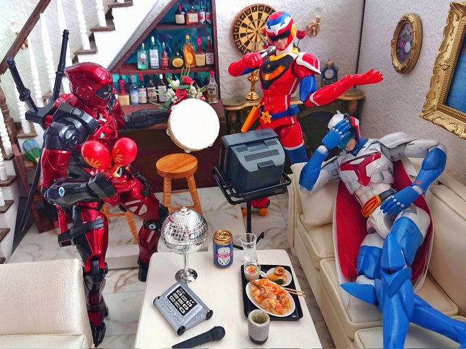 #おもちゃ撮影会 3/29「夢」 任務から帰還しお疲れ気味の健。食事もそこそこに睡魔に襲われ始めた頃… 「寝るなら俺ちゃん達で子守唄を歌ってやるよ♪」 デップー&ムテキング『眠れ~♪眠れ~♪』 「何の悪夢だこれは…頼むから寝かせてくれ💢」 悪気は無いらしいです😅 #千値練 #ファイティングギア