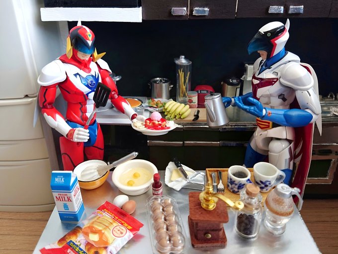 #おもちゃ撮影会 4月9日テーマ「ニックネーム」 アニメ「インフィニティフォース」内でのガッチャマンのニックネームは『おっさん』😭 今日のおやつはパンケーキでした🥞 「おっさん、ほれ出来たぜ」 「俺はおっさんじゃない💢」 物語後半はちゃんと健と呼ばれています😊 #千値練 #ファイティングギア