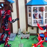 #おもちゃ撮影会 3/31「扉」 前回大騒ぎで子守唄を歌ったデップー&ムテキングの二人は怒った健によって一晩中家から閉め出されるはめに… 翌朝の玄関扉の前の光景です💧 「そろそろ中に入れてくれ~俺ちゃんお腹すいた💦」 結局全員徹夜です😵 #千値練 #ファイティングギア #ファイティングアーマー