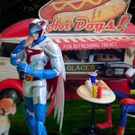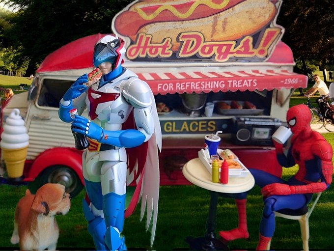 #おもちゃ撮影会 4月6日テーマ「ウォーキング」 ペットの散歩も兼ねて公園をウォーキング…のはずがホットドッグ屋さんの美味しそうな匂いに負けた健さんはただいま買い食い休憩中です😊 車のカウンターにホットドッグを10個並べたのにほとんど写らなくてショック…😭 #千値練 #ファイティングギア