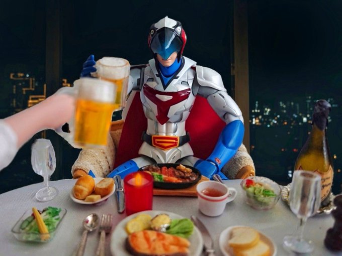 #おもちゃ撮影会 4月7日テーマ「ビール」 『健さん、今日もお疲れ様でした♪とりあえずビールで乾杯✨🍻🎶』 背景以外は全て一括で撮影しているのですが、手前の腕とジョッキが合成っぽくなってしまい残念です😭ジョッキの中身のビールだけレジンで作ってみました😊 #千値練 #ファイティングギア