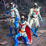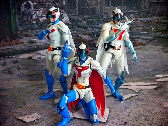 #おもちゃ撮影会 4月8日テーマ「ファイティングポーズ」 ファイティングポーズはブーメランを構えた姿で♪今日はガッチャマン3人です✨ 左右がタツノコヒーローズver.(左がノーマル・右が限定色)で、中央がいつも撮影しているインフィニティフォースver.の健さんです😊 #千値練 #ファイティングギア