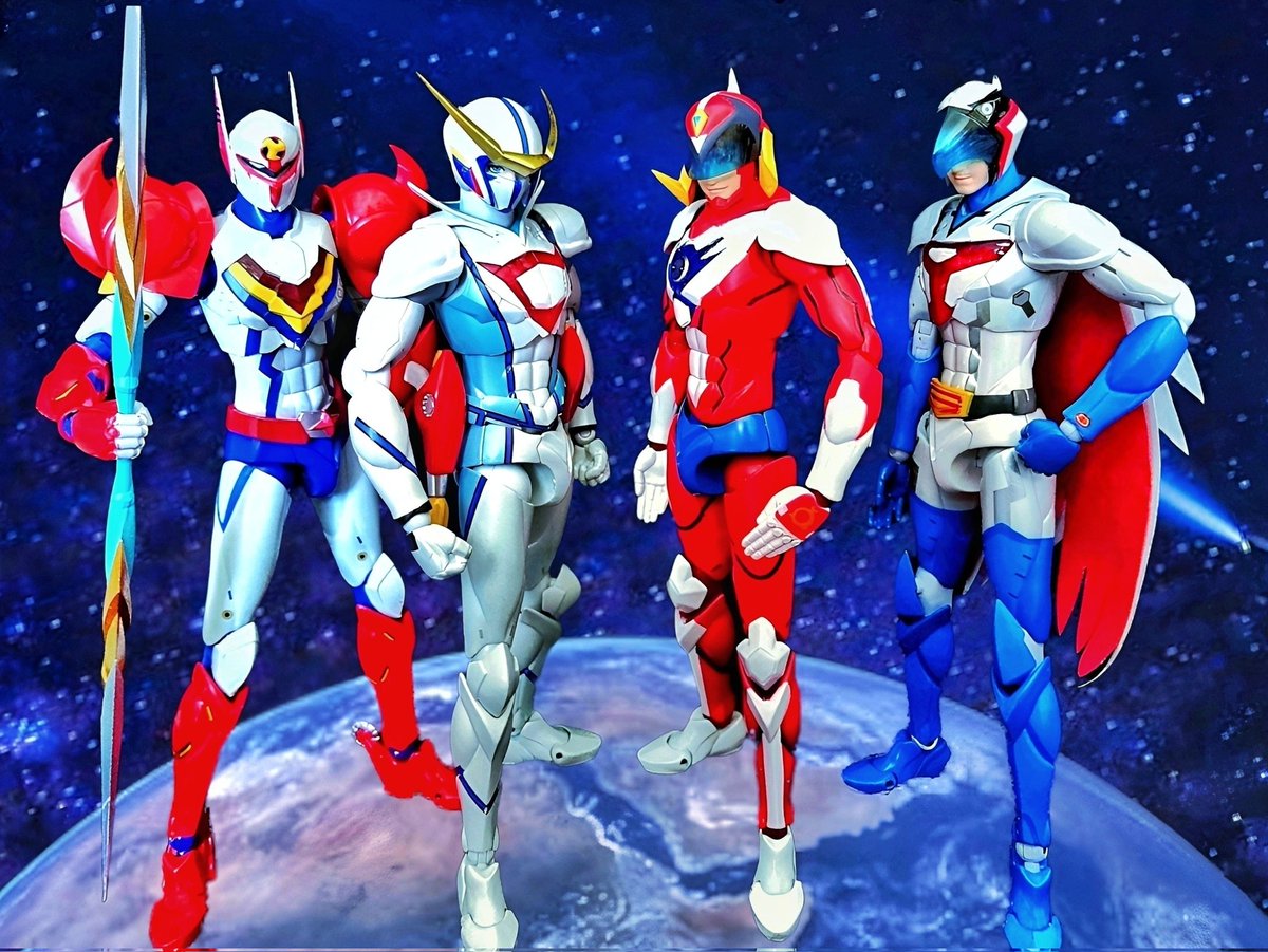 #おもちゃ撮影会 4/22テーマ「地球3」 地球を守るヒーロー達です✨ 健さんを中央にとも思ったのですがアニメ版OPでの立ち位置を再現したのでこの並びになりました。ジョーは劇場版のみの登場なので今回はお留守番です。ちょっぴり拗ねてそう…😨 #千値練 #ファイティングギア #インフィニティフォース
