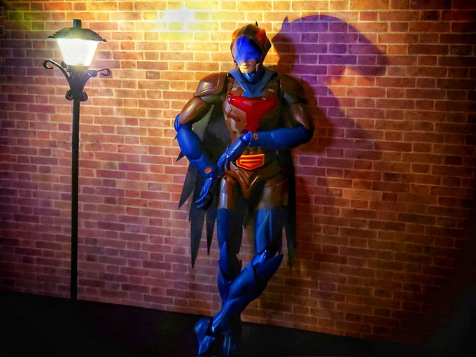 #おもちゃ撮影会 4月11日テーマ「ピンチ」 ヒーローだってたまには「ピンチ」になることも…今日の敵は思いのほか手強く、軽症ですが怪我をしてしまいました😢 ちなみに背中にあるのは電池ケースと胸のマークを光らせるスイッチです💡 甘い物でも食べて元気を出してね😊 #千値練 #ファイティングギア