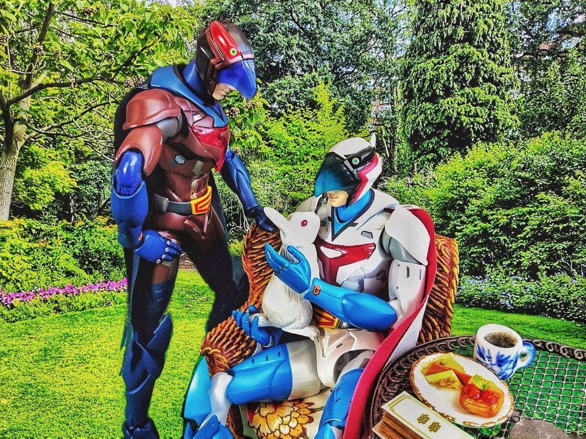 #おもちゃ撮影会 4月30日 テーマ「うさぎ」 今日は天気が良いので庭で軽食をとりながら読書をしていたのですが、どこからともなく「うさぎ」が迷いこんできました🐇突然の可愛い侵入者に健さんもジョーさんもずっと笑みがこぼれっぱなしでした😊 #千値練 #ファイティングギア