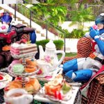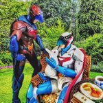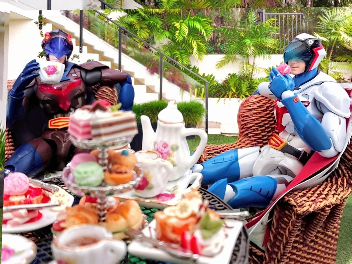 #おもちゃ撮影会 5/22テーマ「初夏」 わが家の健さん達ですが、初夏の爽やかな風が心地よい季節のおやつタイムはだいたい庭のテーブルを囲んで楽しんでいます🍰涼しげなラタン調の椅子とガーデンテーブルは夏の間の彼らのお気に入りの場所です😊🎶 #千値練 #ファイティングギア