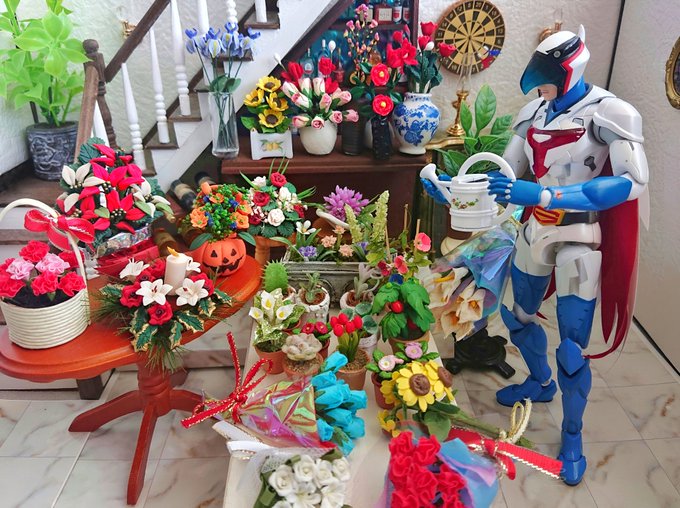 #おもちゃ撮影会 3月28日テーマ「植物」 今までに収集した「植物」系のミニチュアを並べてみした🌷季節やイベント毎にドールハウスに飾る花を置き替えては健さんとの撮影を楽しんでいます😊健さんは、こんなにたくさんだと水やりが大変なんだが…と苦笑していますが(笑) #千値練 #ファイティングギア