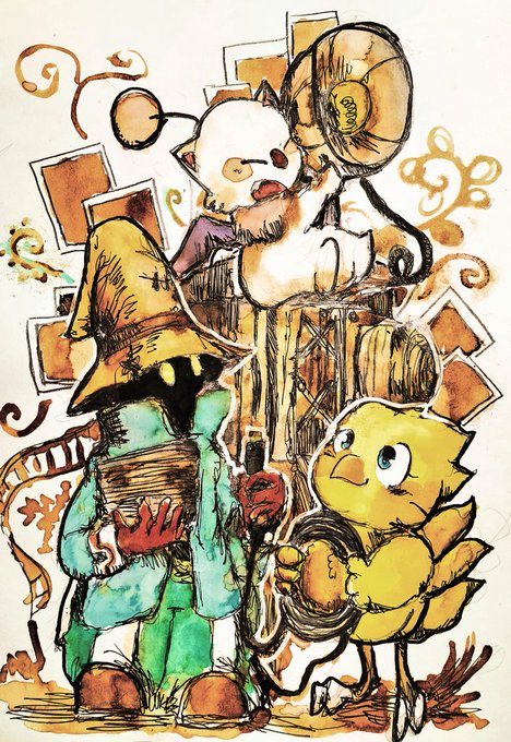 #ChocobosDungeon #ビビ・オルニティア #チョコボ #ファイナルファンタジー #FF #finalfantasy #VIVIOrnitier #アナログ画 #落書き #chocobo 🐤Chocobo & Vivi (Black mage)&Moogle 🟠 📀📸💡