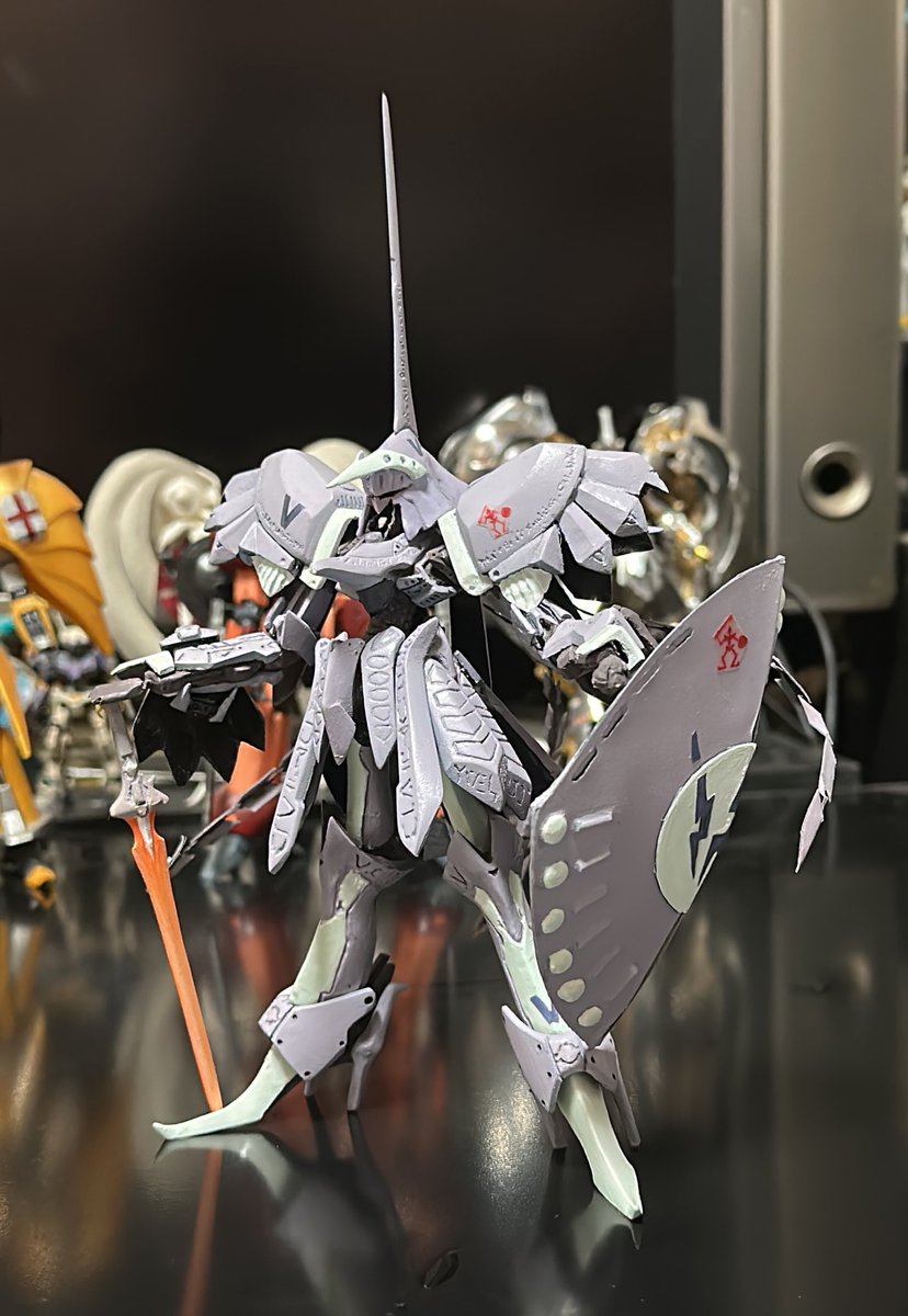 #ファイブスター物語 #FSS_jp 発見したカフスアーマーを取り付けて 棚に戻す途中手が滑って😱😱😱 途中写真を撮る余裕も無く 補修しました😵💫😵💫😵💫 無事に直って良かったです🥹 連勤明けの疲れと明日休みの気の緩み で手元が狂いましたが 1/144紙粘土造形の良いリハビリになりました😅