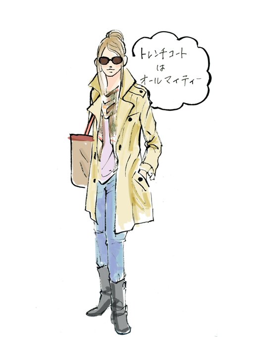 【平成ファッション考】2012のファッションエッセイの連載その11。 こちらもベージュのトレンチコートだけど、 先がフレンチでこちらはロスという感じ? 懐かしい着こなし。 #ファッションイラスト #ファッションスケッチ #イラスト #平成トレンド #fashion