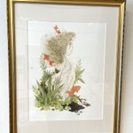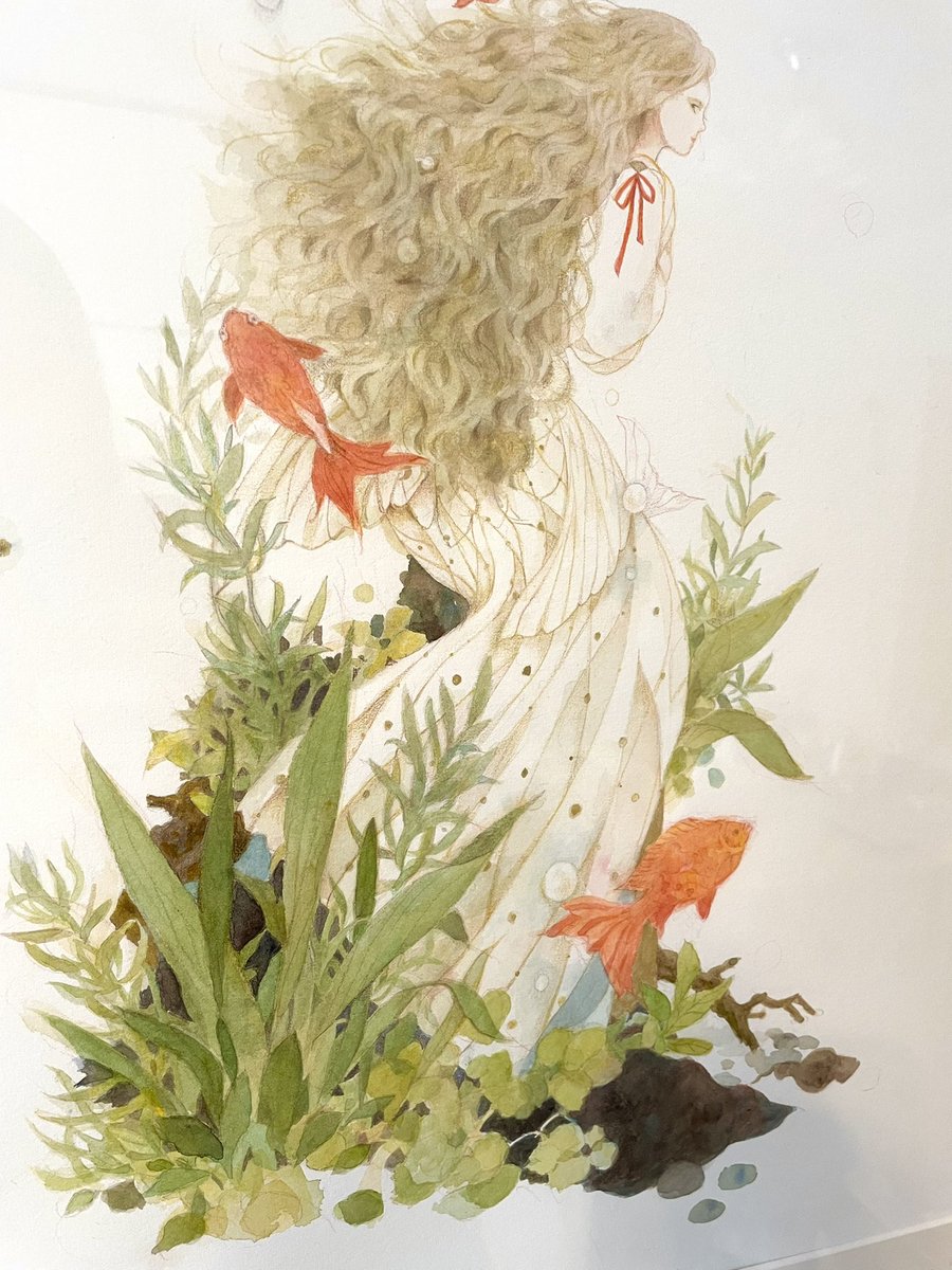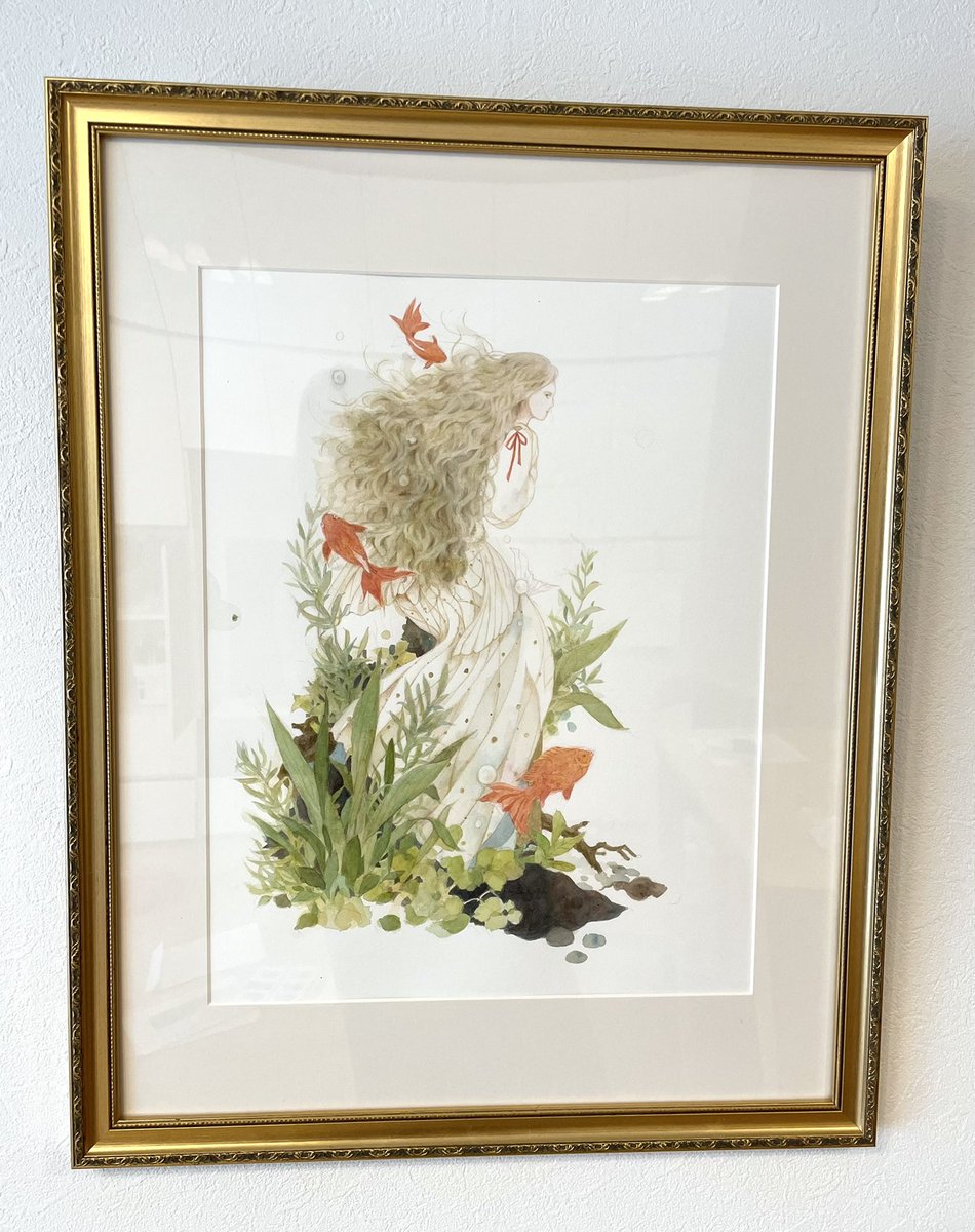 家にある額に入れてみた。久しぶりにF6を額に入れると、やっぱり大きいなあ。 新しい家にピクチャーレールつけたので壁に絵がかけられるように! 「金魚姫」 F6 #透明水彩、#ファブリアーノ水彩紙