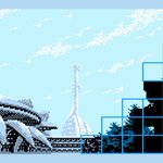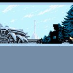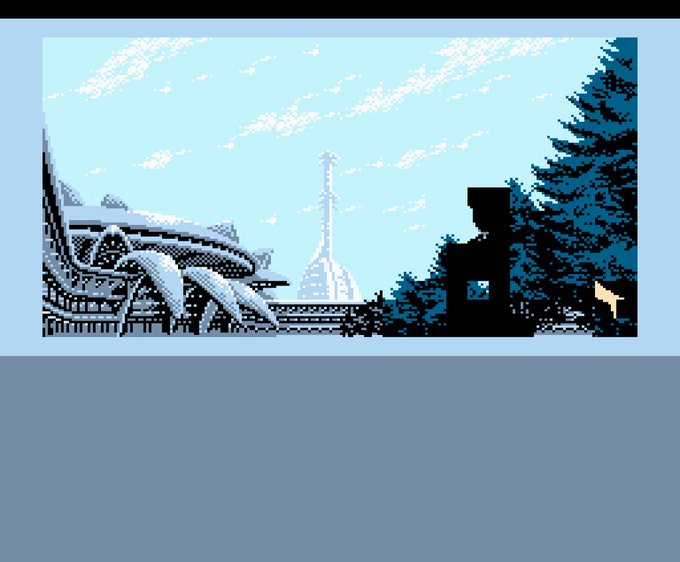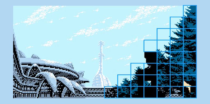 >そしてグラフィック内に8×8ドット単位で配置する事になります。この画像では青枠のBGパレット境界である16×16ドット単位で囲ってある部分になりますが、エディットが可能なだけ木々をエディットします。> #メタルスレイダーグローリー #ファミコン #ドット絵
