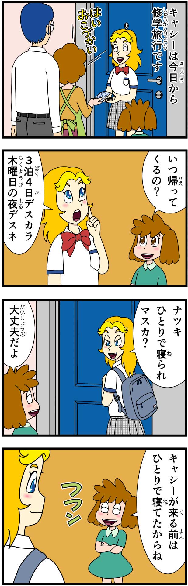 キャシーとわたし ちょこっとリバイバル 昨年のふたりの9月はこんなでした 第19話 キャシーと修学旅行 前編 3回に分けてリバイバル 1回目をドゾー #漫画 #4コマ #ほのぼの #ファミリー #漫画が読めるハッシュタグ #マンガが読めるハッシュタグ #創作漫画 #オリジナル漫画