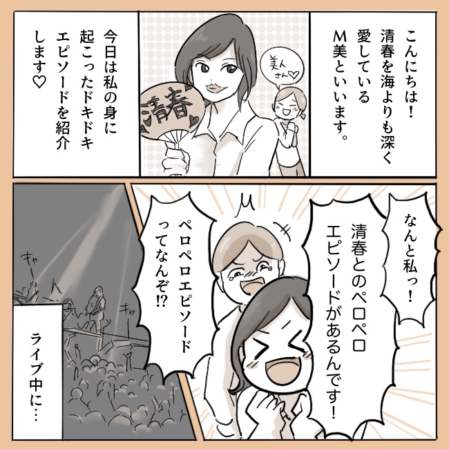 【フォロワーさん体験談①】ペロペロ事件(1/2) 以前募集させていただいた「フォロワーさんと好きなアーティストさんの思い出エピソードを漫画化!」の第一弾です。→2に続く #漫画が読めるハッシュタグ #ファンサ #ライブ