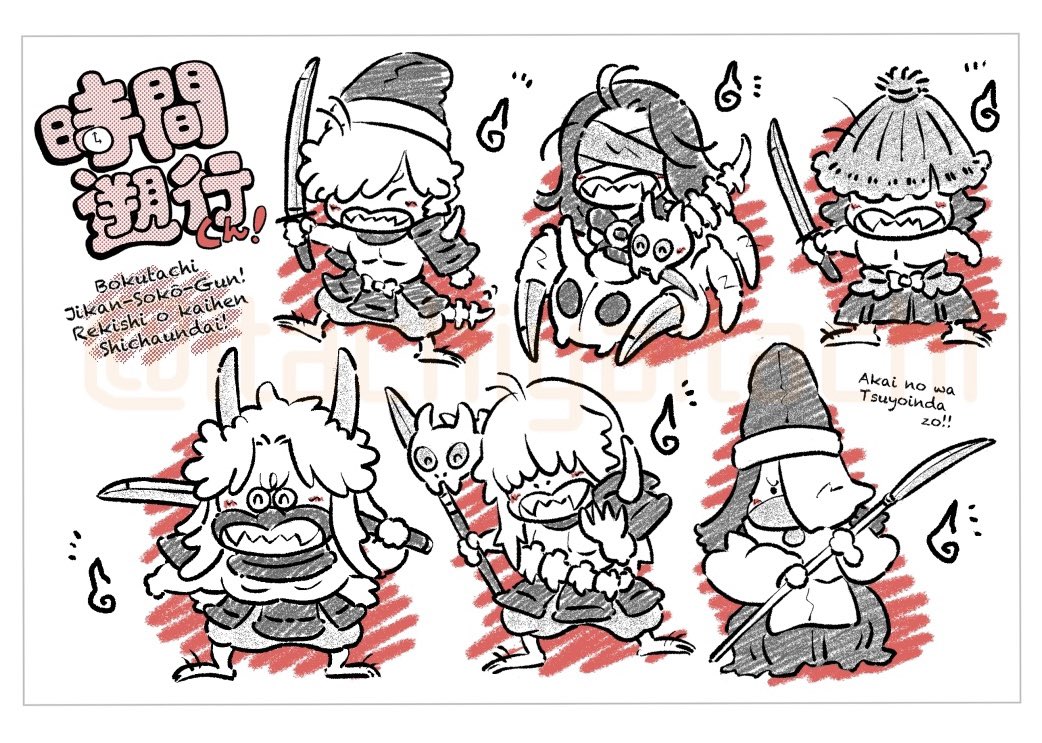 「時間遡行くん」できたー! 80年代流行った #ファンシー絵みやげ あるある(一部、個人的なイメージ) ・白目の中にニコニコ目描きがち ・「くん」とか付けてゆるキャラみたいに呼びがち ・「○○だい!」とか、やんちゃ坊主口調にしがち ・元ネタが可愛いものかどうかは関係ないという強い意志