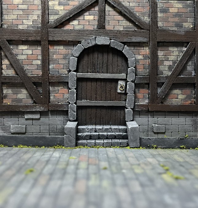 1/12スケールジオラマ《冒険者ギルド前通り》完成致しました。 先週の汎用道路背景のファンタジー版が欲しかったので、昔作った冒険者ギルド(外観)のリメイクも兼ねて製作。 パネル2枚構成なので展開も仕舞うのも楽々です(*'ω'*) #ファンタジーフィギュアで遊ぼう #卓上玩具之世界