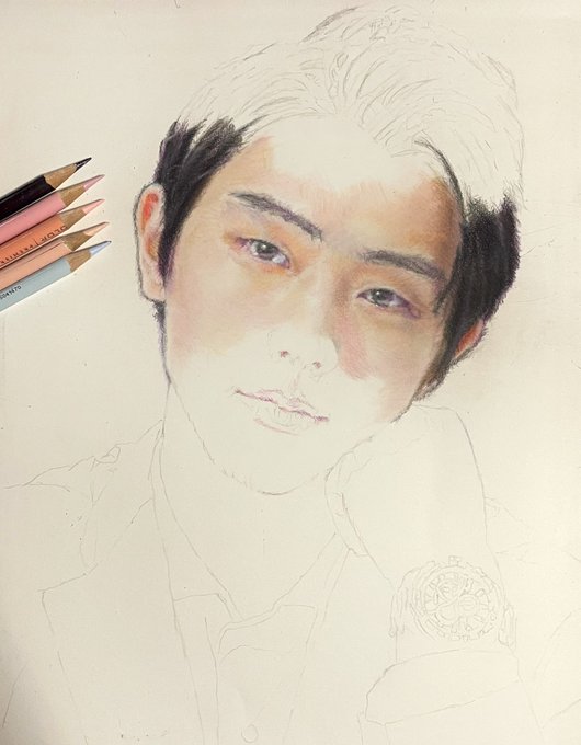 新作 描き始め✏️ 今回もゆっくり経過出しながら進めていきますっ♪ 羽生くんはさらに凛々しくなって 目元 眉もキリッとしてて カッコいいね⛸❄️✨ #羽生結弦 #フィギュアスケーター #色鉛筆画