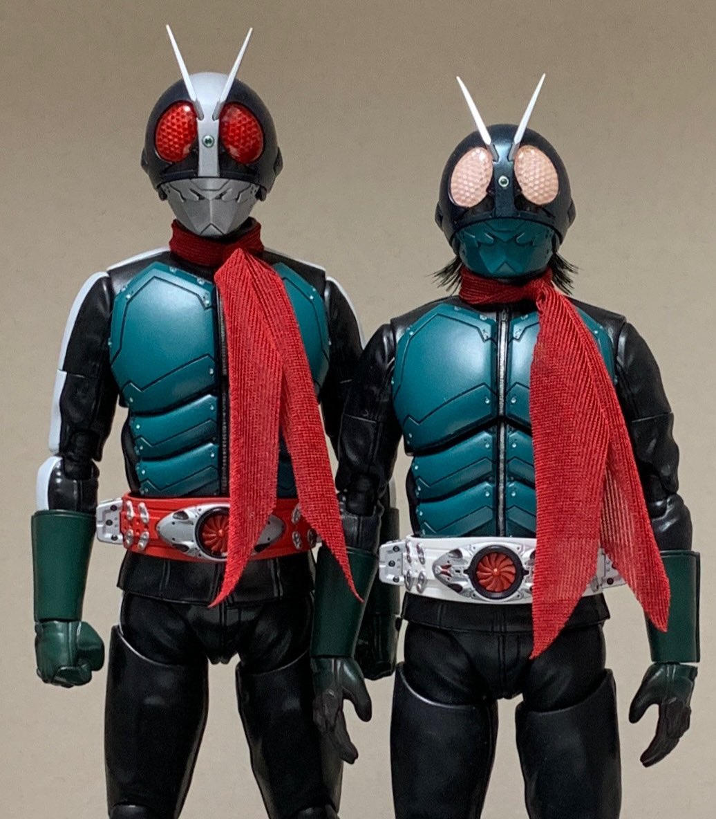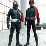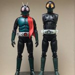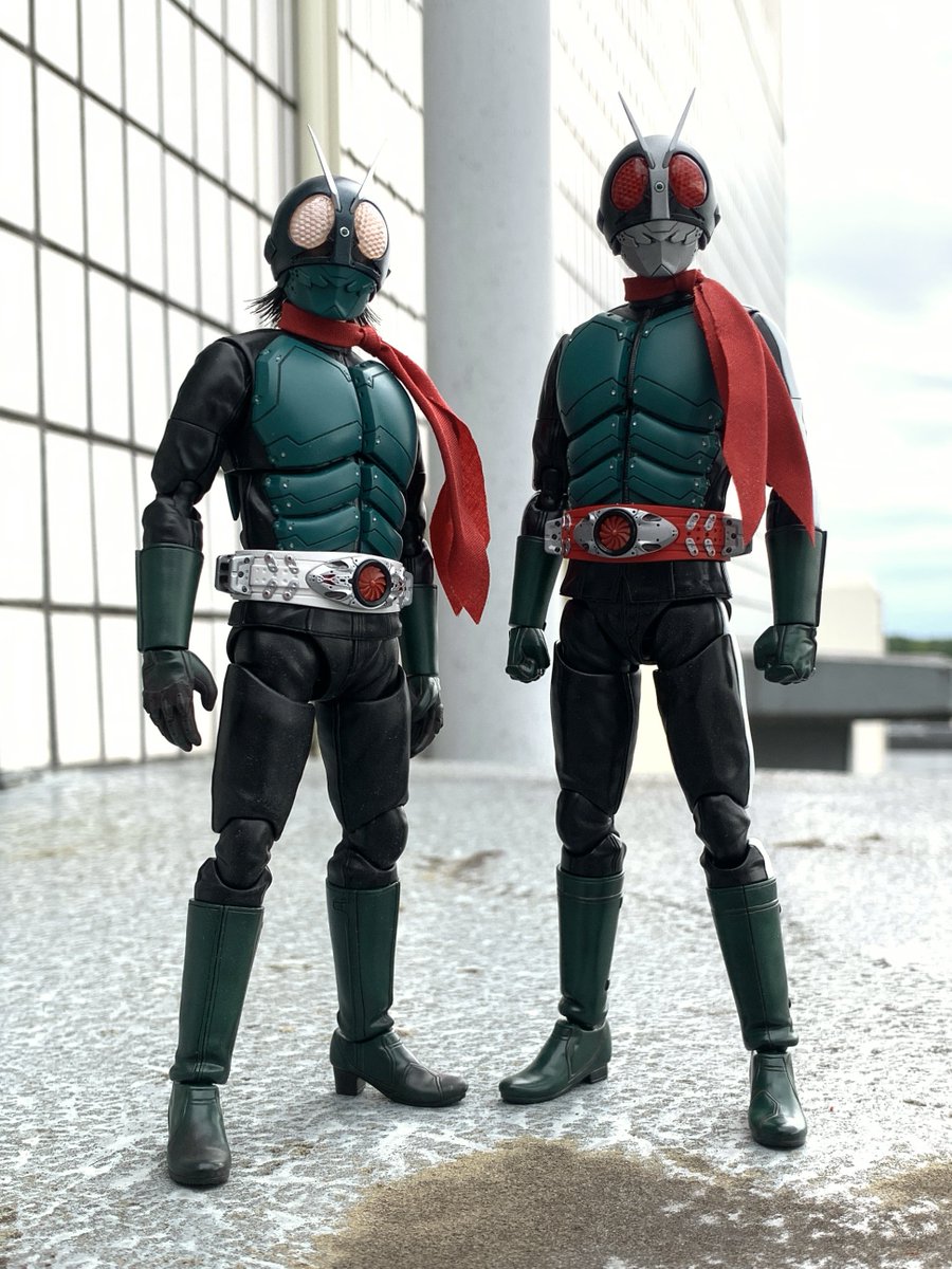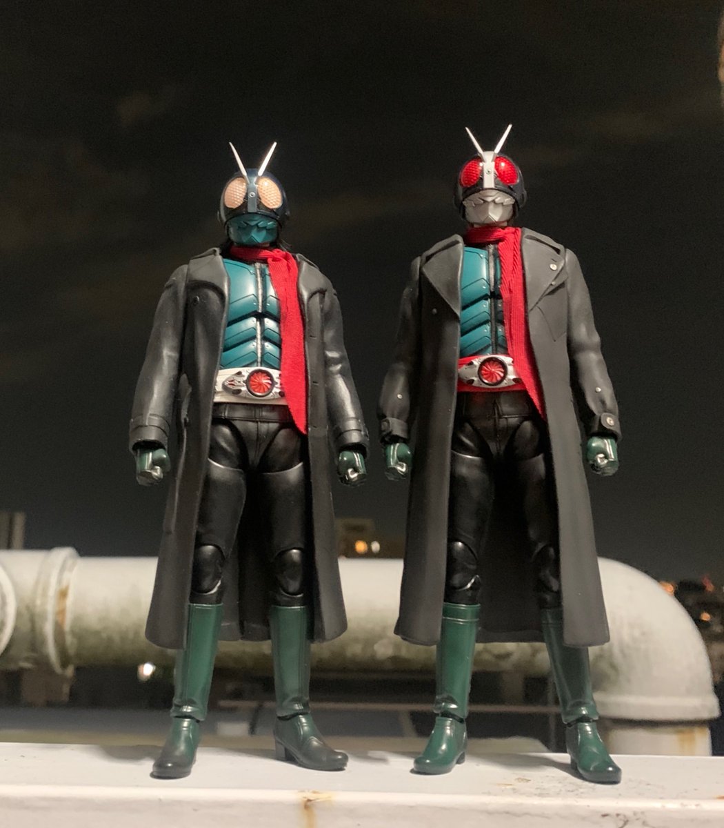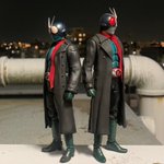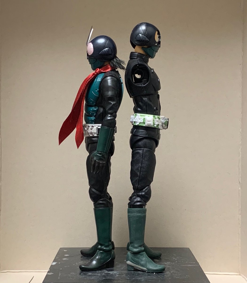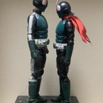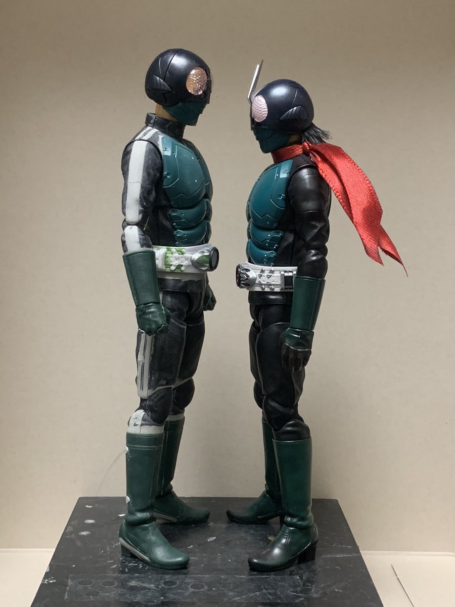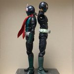 マスクをリペイントした本郷ライダーとダブルライダー2ショット!表現したかったのはこの体格差!とマスク差異! 因みに鑑賞7回目はレイトショーでも号泣してきました! #シン・仮面ライダー #フィギュアライズスタンダード