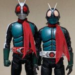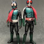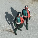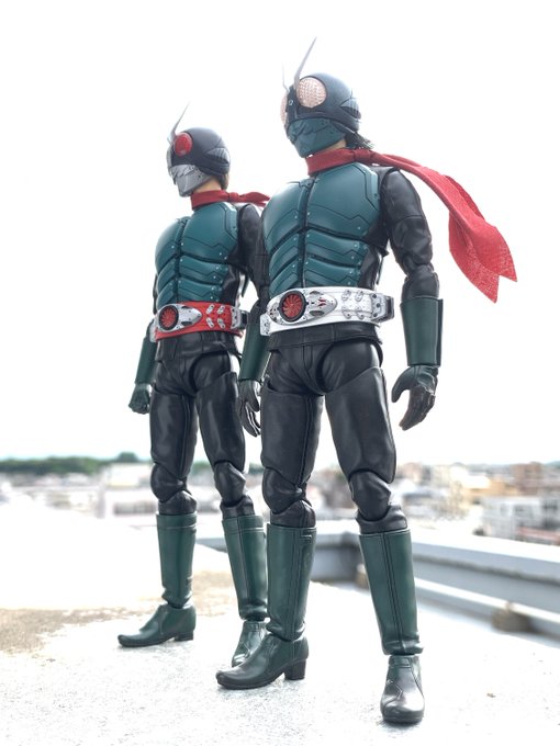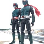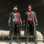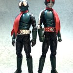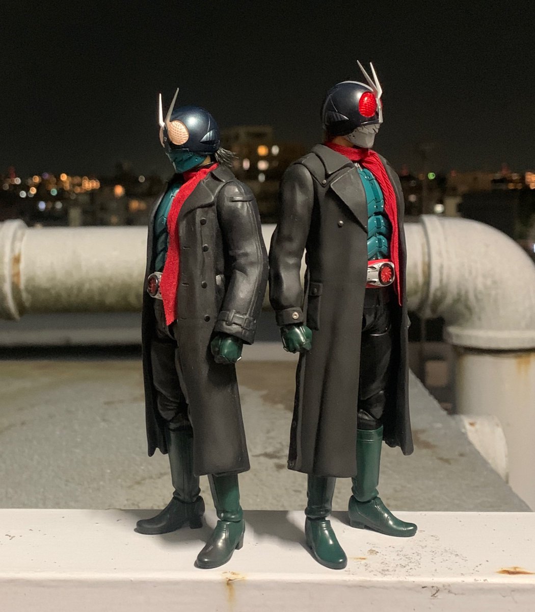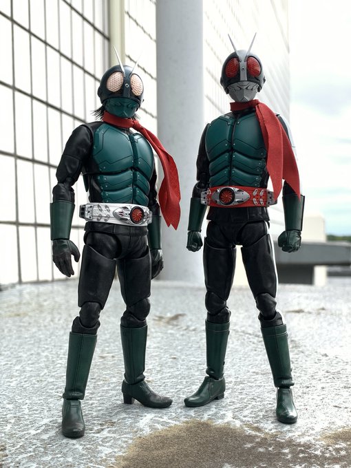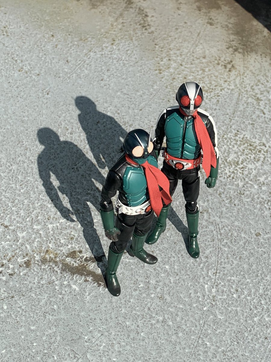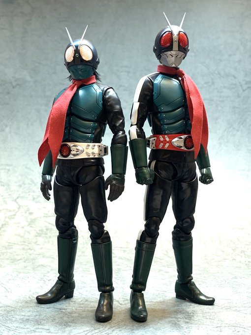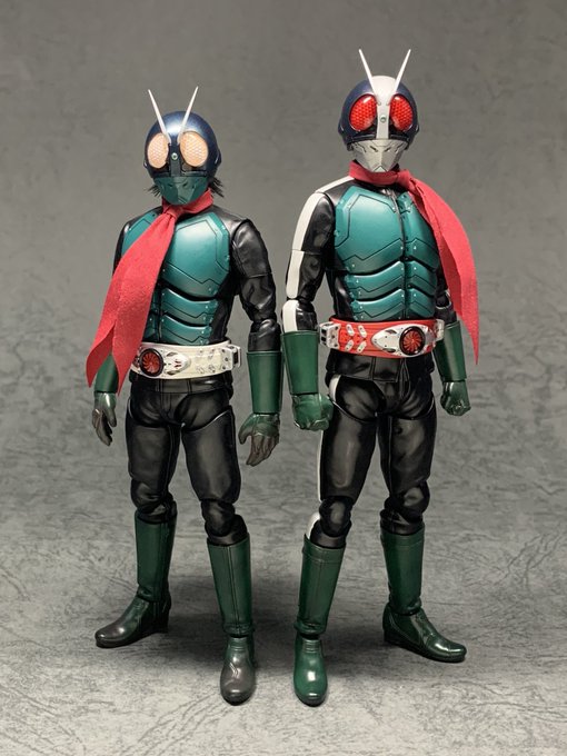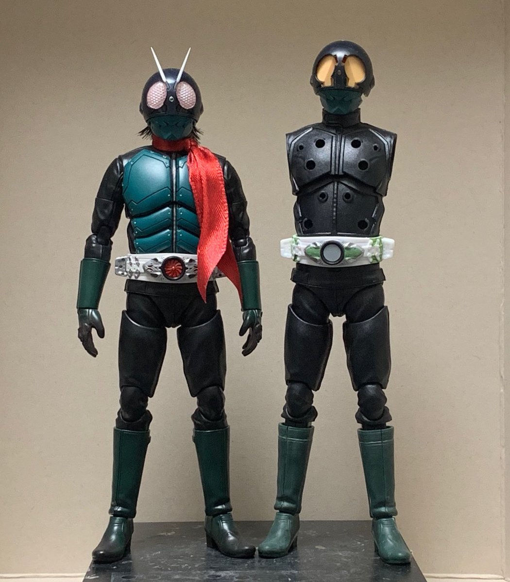 マスクをリペイントした本郷ライダーとダブルライダー2ショット!表現したかったのはこの体格差!とマスク差異! 因みに鑑賞7回目はレイトショーでも号泣してきました! #シン・仮面ライダー #フィギュアライズスタンダード